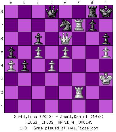 Last move : 1-0 2013 November 17 11:44:30 [Event "FICGS__CHESS__RAPID_A__000143"] [Site "FICGS"] [Date "2013.06.29"] [Round "1"] [White "Sorbi,Luca"] [Black "Jabot,Daniel"] [Result "1-0"] [WhiteElo "2000"] [BlackElo "1972"] 1.d4 d5 2.c4 c6 3.Nf3 dxc4 4.e3 b5 5.a4 a5 6.b3 e6 7.bxc4 Bb4+ 8.Nbd2 Bc3 9.Ra2 b4 10.Bb2 Bxb2 11.Rxb2 Nf6 12.c5 Nbd7 13.Bc4 O-O 14.O-O Nd5 15.Qb3 Nc3 16.Rc1 Ba6 17.Bxa6 Rxa6 18.Nc4 h6 19.Nfe5 Nxe5 20.Nxe5 Qc7 21.Nc4 Nd5 22.g3 Qe7 23.e4 Qg5 24.Re1 Ne7 25.Qd1 Ng6 26.Rb3 Ra7 27.h4 Qd8 28.Kg2 Ne7 29.Rf3 Rd7 30.Rd3 Qc7 31.Qe2 Kh8 32.Qh5 R7d8 33.Qf3 Kg8 34.Qe2 Nc8 35.Red1 Kh8 36.h5 f6 37.Qg4 Rfe8 38.Rc1 Qa7 39.R3d1 Kg8 40.Rd2 Kh8 41.Kf1 Rd7 42.e5 f5 43.Qg6 Rde7 44.Nd6 Rf8 45.Kg2 Qd7 46.Rd3 Kg8 47.f4 Kh8 48.Rd2 Qd8 49.Kh3 Qd7 50.Rg2 Qa7 51.Rcg1 Qd7 52.Re2 Rg8 53.g4 fxg4+ 54.Rxg4 Rf8 55.Rc2 Rg8 56.f5 exf5 57.Rf4 Rf8 58.Nxf5 Rg8 59.Rcf2 Re6 60.Qg4 R6e8 61.Nd6 Re7 62.Rf5 Qd8 63.Nf7+ Rxf7 64.Rxf7 Ne7 65.Qe6 1-0 QGD Slav : 3.Nf3 Kingside Castling by player Black (move 13) Kingside Castling by player White (move 14) Player White won this chess game. Follow this game move after move (download)Different people feel differently about resigning. (Bobby Fischer) Ohne ihre Erfolge schmälern zu wollen würde ich sagen Petrosian, Spassky und Karpov verdanken ihre Siege ihren Trainern - Boleslavsky, Bondarevsky und Furman. (Mikhail Moiseyevich Botvinik) Desconfianza es la característica mas necesaria de un jugador de Ajedrez. (Siegbert Tarrasch) Le système Elo représente seulement une moyenne. Il est simplement un indicateur de votre stabilité. (Anatoli Karpov) The weakness of an artist is dogma. (Josh Waitzkin)