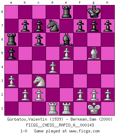 Last move : 1-0 2013 October 19 16:37:58 [Event "FICGS__CHESS__RAPID_A__000143"] [Site "FICGS"] [Date "2013.06.29"] [Round "1"] [White "Gorbatov,Valentin"] [Black "Berkman,Sam"] [Result "1-0"] [WhiteElo "1939"] [BlackElo "2000"] 1.e4 e5 2.Nf3 Nc6 3.Bb5 a6 4.Ba4 Nf6 5.O-O Be7 6.Re1 O-O 7.Bxc6 dxc6 8.Nxe5 Be6 9.d4 Re8 10.Nc3 Qd6 11.Nf3 Nd7 12.e5 Qb4 13.a3 Qb6 14.Qd3 a5 15.Ng5 Bxg5 16.Bxg5 Qa6 17.Qxa6 Rxa6 18.Rad1 1-0 This chess game has been lost on time (started : 2013.06.29 14:14:43) Ruy Lopez : Closed defense Kingside Castling by player White (move 5) Kingside Castling by player Black (move 6) Player White won this chess game. Follow this game move after move (download)Fischer is completely natural. He plays no roles. He's like a child. Very, very simple. (Zita Rajcsanyi) Die Leute spielen gegen mich seit 15 Jahren unter Ihren Möglichkeiten. (Robert James Fischer) Si el ingenio solamente fuese necesario para lucirse, las mujeres serían las mejores jugadoras de Ajedrez del mundo. (Albin) J'ai toujours senti une vague pitié pour l'homme qui ne connaît rien aux échecs, tout comme j'en aurais pour un homme ignorant de l'amour. Les Echecs, comme la musique ou comme l'amour, ont le pouvoir de rendre heureux. (Siegbert Tarrasch) All politicians must be presumed guilty until they are proven innocent. (Dinesh De Silva)