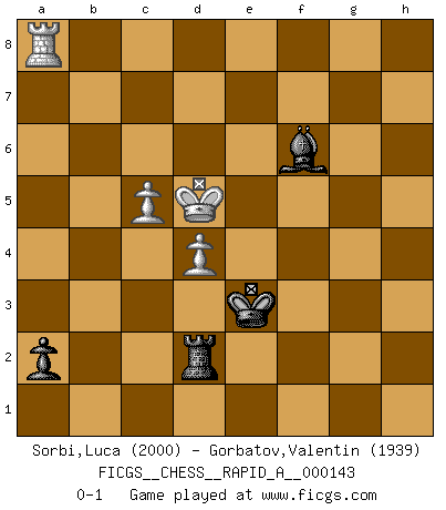 Last move : 0-1 2013 October 24 14:53:22 [Event "FICGS__CHESS__RAPID_A__000143"] [Site "FICGS"] [Date "2013.06.29"] [Round "1"] [White "Sorbi,Luca"] [Black "Gorbatov,Valentin"] [Result "0-1"] [WhiteElo "2000"] [BlackElo "1939"] 1.e4 c5 2.Nf3 Nc6 3.d4 cxd4 4.Nxd4 Nf6 5.Nc3 e5 6.Ndb5 d6 7.Bg5 a6 8.Bxf6 gxf6 9.Na3 f5 10.Bd3 Rg8 11.g3 Nd4 12.Qh5 fxe4 13.Bxe4 Bg4 14.Qxh7 Rg7 15.Qh6 Be6 16.Qe3 d5 17.Bxd5 Rc8 18.Qxe5 Rxc3 19.bxc3 Qxd5 20.Qxd5 Bxd5 21.cxd4 Bxh1 22.Kd2 Bd5 23.Nb1 f5 24.Nc3 Bc4 25.Nd1 f4 26.Nb2 Bf7 27.Nd3 Rh7 28.a4 Rxh2 29.gxf4 Bd5 30.Rg1 Be7 31.Rg6 a5 32.Ke2 Rh1 33.Ke3 Ra1 34.Rh6 Rxa4 35.Rh8+ Kf7 36.Rh5 Bc6 37.Ne5+ Kg7 38.Nxc6 bxc6 39.c3 Ra2 40.Re5 Kf7 41.f5 a4 42.Ra5 Kf6 43.Ra6 Kxf5 44.Rxc6 a3 45.Ra6 Rc2 46.Ra5+ Kg4 47.f3+ Kg3 48.Kd3 Rf2 49.Ra8 a2 50.Ke3 Rxf3+ 51.Ke4 Rf4+ 52.Kd3 Rf2 53.Ke3 Kg2 54.Ke4 Rd2 55.Kd5 Kf2 56.c4 Bf6 57.c5 Ke3 0-1 Sicilian : Pelikan (Lasker/Sveshnikov) variation 10 pieces endgame at move 43 : White KRPPP , Black KRBPP WHITE : King + 1 Rook 3 Pawns BLACK : King + 1 Rook 1 Bishop 2 Pawns 9 pieces endgame at move 44 : White KRPPP , Black KRBP WHITE : King + 1 Rook 3 Pawns BLACK : King + 1 Rook 1 Bishop 1 Pawn 8 pieces endgame at move 50 : White KRPP , Black KRBP WHITE : King + 1 Rook 2 Pawns BLACK : King + 1 Rook 1 Bishop 1 Pawn Player Black won this chess game. Follow this game move after move (download)A good player is always lucky. (Jose Raul Capablanca) Der 70jährige Viktor Kortschnoi: Die Rentenanstalt wollte mich zwingen in Rente zu gehen. Meine Frau erhält jetzt eine Pension- und ich zahle weiter in die Rentenkasse ein! (Viktor Kortschnoi) Un sacrificio se refuta mucho mejor al aceptarlo. (Wilhelm Steinitz) Pour moi, les échecs ne sont pas un jeu mais un art. (Alexandre Alekhine) Animated gif is worth one mega-word. (Unknown)