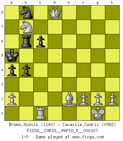 Last move : 1-0 2013 July 5 22:12:52 [Event "FICGS__CHESS__RAPID_E__000107"] [Site "FICGS"] [Date "2013.06.30"] [Round "1"] [White "Bromo,Alexis"] [Black "Cavaille,Cedric"] [Result "1-0"] [WhiteElo "1140"] [BlackElo "0982"] 1.d4 d5 2.c4 dxc4 3.Nc3 c6 4.e4 b5 5.Nf3 Nf6 6.Bg5 e6 7.e5 h6 8.Bh4 g5 9.Bxg5 hxg5 10.exf6 Qxf6 11.Ne4 Qd8 12.Nfxg5 Be7 13.Qf3 f6 14.Nh3 Qxd4 15.Rd1 Qxb2 16.Nd6+ Kf8 17.Nxc8 Qe5+ 18.Be2 c3 19.Nxe7 c2 20.Ng6+ Ke8 21.Nxe5 cxd1Q+ 22.Bxd1 fxe5 23.Ng5 Ke7 24.Qf7+ Kd6 25.Qxe6+ Kc7 26.Qxe5+ Kb6 27.Qxh8 a5 28.Qd8+ Kb7 29.Ne6 Na6 30.Qd7+ Kb6 31.Nd4 Nb8 32.Qd8+ Kb7 33.Bf3 Ra6 34.O-O a4 35.Rc1 b4 36.Nb5 Rb6 37.Nd6+ Ka6 38.Be2+ Ka5 39.Nb7+ 1-0 Queen's gambit accepted Promotion Queen by player Black (move 21) Kingside Castling by player White (move 34) Player White won this chess game. Follow this game move after move (download)Dazzling combinations are for the many, shifting wood is for the few. (Georg Kieninger) Später, ... hatte ich zunehmend Erfolg in entscheidenden Partien. Vielleicht weil ich eine einfache Wahrheit erkannte: nicht nur ich hatte Angst, auch mein Gegner. (Mikhail Nekhemyevich Tal) Tu puedes aprender mucho mas de una partida que pierdas que de una partida ganada. Tendras que perder cientos de partidas antes de llegar a ser un buen jugador. (Jose Raul Capablanca) Mais l'homme est une créature légère et illogique : semblable au joueur d'échecs, il n'aime que le processus du but à atteindre, non le but lui-même. (Dostoïevsky) Always be a first-rate version of yourself, instead of a second-rate version of somebody else. (Judy Garland)