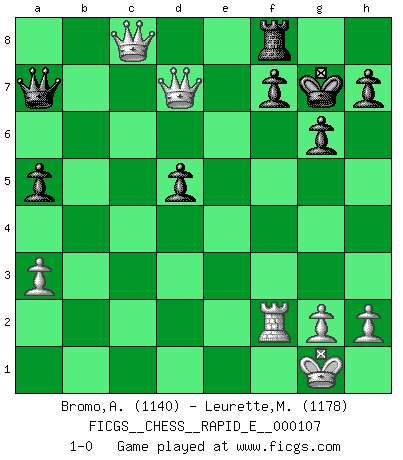 Last move : 1-0 2013 August 31 16:0:23 [Event "FICGS__CHESS__RAPID_E__000107"] [Site "FICGS"] [Date "2013.06.30"] [Round "1"] [White "Bromo,Alexis"] [Black "Leurette,Marc-Antoine"] [Result "1-0"] [WhiteElo "1140"] [BlackElo "1178"] 1.d4 d6 2.c4 Nf6 3.Nc3 e6 4.Nf3 d5 5.c5 b6 6.b4 bxc5 7.bxc5 c6 8.Bg5 Be7 9.Bxf6 Bxf6 10.e3 O-O 11.Bd3 a5 12.Na4 Ba6 13.Bxa6 Nxa6 14.O-O Re8 15.a3 e5 16.Re1 e4 17.Nd2 Nc7 18.f3 exf3 19.Nxf3 Bg5 20.Nxg5 Qxg5 21.Qd3 g6 22.Ra2 Re6 23.Nc3 Kg7 24.Rf2 Nb5 25.Nxb5 cxb5 26.Qxb5 Rxe3 27.Rxe3 Qxe3 28.Qd7 Rf8 29.c6 Qxd4 30.c7 Qa7 31.c8Q 1-0 Old Indian defense Kingside Castling by player Black (move 10) Kingside Castling by player White (move 14) Promotion Queen by player White (move 31) Player White won this chess game. Follow this game move after move (download)The hallmark of the artist is simplicity. (Larry Evans) Das Schach ist nichts für kleine Geister, es beansprucht einen vollen Mann, der sich nicht sklavisch an das Überlieferte hält, sondern selbständig die Tiefen des Spiels zu ergründen sucht. (Wilhelm Steinitz) Evita las multitudes. Haz independientemente tu propio razonamiento. Trata de ser el jugador de Ajedrez, no la pieza de Ajedrez. (Ralph Charell) Le jeu d'échecs fait naître et fortifie en nous plusieurs qualités précieuses dans le cours de l'existence, telles que la prévoyance, la circonspection, la prudence, et la persévérance. (Benjamin Franklin - 1783, la morale des échecs) The best weapon against an enemy is another enemy. (Friedrich Nietzsche)