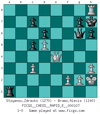 Last move : 1-0 2013 July 11 21:54:10 [Event "FICGS__CHESS__RAPID_E__000107"] [Site "FICGS"] [Date "2013.06.30"] [Round "1"] [White "Stoyanov,Zdravko"] [Black "Bromo,Alexis"] [Result "1-0"] [WhiteElo "1270"] [BlackElo "1140"] 1.e4 e5 2.Nf3 Nc6 3.Bb5 d6 4.Bxc6+ bxc6 5.h3 Nf6 6.d3 Ba6 7.b3 h6 8.O-O Be7 9.Re1 O-O 10.Nc3 Nd7 11.a4 Nc5 12.Be3 Ne6 13.b4 Re8 14.b5 Bb7 15.Rb1 c5 16.a5 a6 17.Ra1 Ng5 18.Bd2 Nxf3+ 19.Qxf3 Bg5 20.Bxg5 Qxg5 21.Nd5 Bxd5 22.exd5 axb5 23.a6 Ra7 24.c3 Rea8 25.Ra5 Rxa6 26.Rxb5 f5 27.Rb7 Ra1 28.Rxa1 Rxa1+ 29.Kh2 e4 30.dxe4 fxe4 31.Rb8+ Kh7 32.Qxe4+ Qg6 33.Rh8+ 1-0 Ruy Lopez : Old Steinitz defense Kingside Castling by player White (move 8) Kingside Castling by player Black (move 9) Player White won this chess game. Follow this game move after move (download)Chess is everything: art, science and sport. (Anatoly Karpov) Ich glaube nicht an Psychologie, ich glaube an gute Züge. (Robert James Fischer) Te sientas frente a un tablero y repentinamente tu corazón brinca. Tu mano tiembla al tomar una pieza y moverla. Pero lo que el Ajedrez te enseña es que tu debes permanecer ahí con calma y pensar de que si realmente es una buena idea o de que si hay otras ideas mejores. (Stanley Kubrick) La menace est plus forte que l'exécution. (Aaron Nimzovitch) Experience is the name we all give to our mistakes. (Oscar Wilde)