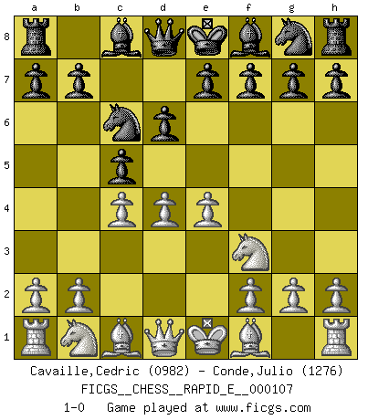 Last move : 1-0 2013 August 4 5:7:43 [Event "FICGS__CHESS__RAPID_E__000107"] [Site "FICGS"] [Date "2013.06.30"] [Round "1"] [White "Cavaille,Cedric"] [Black "Conde,Julio"] [Result "1-0"] [WhiteElo "0982"] [BlackElo "1276"] 1.e4 c5 2.c4 Nc6 3.Nf3 d6 4.d4 1-0 This chess game has been lost on time (started : 2013.06.30 16:29:46) Sicilian defense Player White won this chess game. Follow this game move after move (download)Not only will I predict his triumph over Botvinnik, but I'll go further and say that he'll probably be the greatest Chess player that ever lived. (John Collins) Spiel ein langweiliges Spiel zu Ende und lustige Dinge können passieren. (Hans Ree) El Ajedrez, como cualquier actividad creativa, solo puede existir a través del esfuerzo combinado de aquellos que tienen talento creativo y de aquellos que poseen la habilidad de organizar su trabajo creativo. (Mikhail Botvinnik) Vous m'avez demandé de vous exposer quel est le fondement de la prière. Je ne fais que préparer les pièces du jeu sur la table... Nous sera-t-il permis d'en adopter les règles et si nous les appliquons scrupuleusement nous ne tarderons pas à faire mat le Roi divin ! Il ne pourra échapper à nos mains. (Sainte Thérèse d'Avila, Chemin de perfection) To steal ideas from one person is plagiarism. To steal from many is research. (Unknown)
