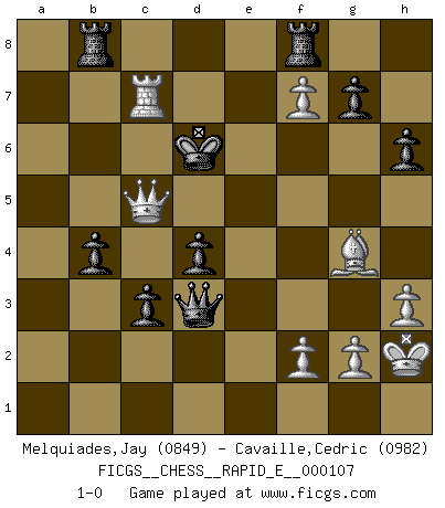 Last move : 1-0 2013 July 14 21:24:40 [Event "FICGS__CHESS__RAPID_E__000107"] [Site "FICGS"] [Date "2013.06.30"] [Round "1"] [White "Melquiades,Jay"] [Black "Cavaille,Cedric"] [Result "1-0"] [WhiteElo "0849"] [BlackElo "0982"] 1.e4 e5 2.Nf3 Nf6 3.d3 Nc6 4.c3 d5 5.Bg5 Be7 6.Bxf6 Bxf6 7.h3 d4 8.cxd4 Nxd4 9.Nxd4 exd4 10.Nd2 Qd6 11.Rc1 Qb4 12.b3 c5 13.Rc4 Qa3 14.Ra4 Qb2 15.Nc4 Qc3+ 16.Ke2 Bd7 17.Ra5 Be7 18.Kf3 b5 19.Ne5 Qxa5 20.Nxd7 Kxd7 21.e5 Qxa2 22.Be2 a5 23.Kg3 h6 24.Bf3 Rac8 25.Bg4+ Kc6 26.Qf3+ Kc7 27.Rc1 Rb8 28.Qf4 Rhf8 29.e6 Kb6 30.Re1 Qxb3 31.exf7 Qxd3+ 32.Kh2 c4 33.Rxe7 Kc5 34.Qc1 c3 35.Qa3+ b4 36.Qxa5+ Kd6 37.Rd7+ Kc6 38.Rc7+ Kd6 39.Qc5+ 1-0 Petrov's defense Player White won this chess game. Follow this game move after move (download)Chess mastery essentially consists of analyzing Chess positions accurately. (Mikhail Botvinnik) Ich bin der einzige Schachspieler, der sich während der Vorbereitungen zum Turnier verletzt hat. (Woody Allen) No hay un Gran Maestro de Ajedrez que sea normal; solo se diferencían ellos por la magnitud de su locura. (Viktor Korchnoi) L'attaque fait le spectacle, la défense gagne les matchs. (Dicton footballistique) Lamb in skin of tiger, still fears the wolf. (Chinese proverb)