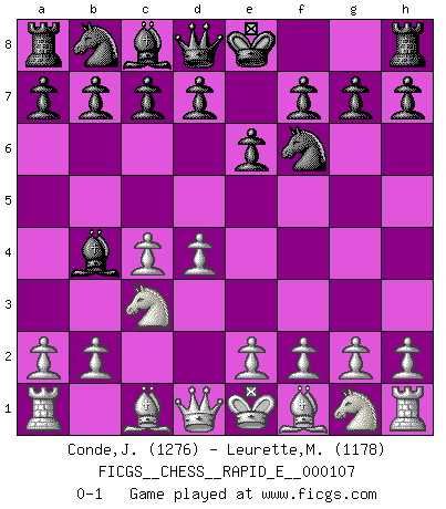 Last move : 0-1 2013 August 5 5:12:14 [Event "FICGS__CHESS__RAPID_E__000107"] [Site "FICGS"] [Date "2013.06.30"] [Round "1"] [White "Conde,Julio"] [Black "Leurette,Marc-Antoine"] [Result "0-1"] [WhiteElo "1276"] [BlackElo "1178"] 1.d4 Nf6 2.c4 e6 3.Nc3 Bb4 0-1 This chess game has been lost on time (started : 2013.06.30 16:29:46) Nimzo-Indian defense Player Black won this chess game. Follow this game move after move (download)Alekhine is a poet who creates a work of art out of something that would hardly inspire another man to send home a picture post card. (Max Euwe) Ich glaube, ich kenne inzwischen die Gründe für mein Versagen: schachliche Charakterfehler. Ich war nie ein Wunderkind und in meiner gesamten menschlichen Entwicklung immer zu langsam. (Viktor Kortschnoi) Si el ingenio solamente fuese necesario para lucirse, las mujeres serían las mejores jugadoras de Ajedrez del mundo. (Albin) Le profane ne songe pas à la somme de jouissance dont il se prive, qui méconnaît ce jeu aux ressources aussi variées que passionnantes. (Jean-Marie Jeanton-Lamarche) Never was anything great achieved without danger. (Niccolo Machiavelli)