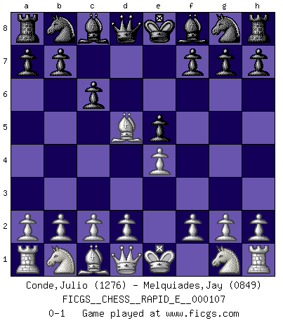Last move : 0-1 2013 August 3 5:4:34 [Event "FICGS__CHESS__RAPID_E__000107"] [Site "FICGS"] [Date "2013.06.30"] [Round "1"] [White "Conde,Julio"] [Black "Melquiades,Jay"] [Result "0-1"] [WhiteElo "1276"] [BlackElo "0849"] 1.e4 e5 2.Bc4 d5 3.Bxd5 c6 0-1 This chess game has been lost on time (started : 2013.06.30 16:29:46) Bishop's Opening Player Black won this chess game. Follow this game move after move (download)The game of Chess is not merely an idle amusement; several very valuable qualities of the mind are to be acquired and strengthened by it, so as to become habits ready on all occasions; for life is a kind of Chess. (Benjamin Franklin) Herr Iljumschinow ist ein etwas merkwürdiger Geschäftsmann: Er arbeitet zusammen mit Leuten wie Muammar al-Gaddafi; früher ist das Saddam Hussein gewesen. (Joel Lautier) Una buena memoria, concentración, imaginación y una fuerte voluntad, se requiere para llegar a ser un buen jugador. (Bobby Fischer) L'ordinateur a tué l'originalité. Il n'y a plus guère d'aventures sur l'échiquier. (Jacob Murray) The quality of decision is like the well-timed swoop of a falcon which enables it to strike and destroy its victim. (Sun Tzu)