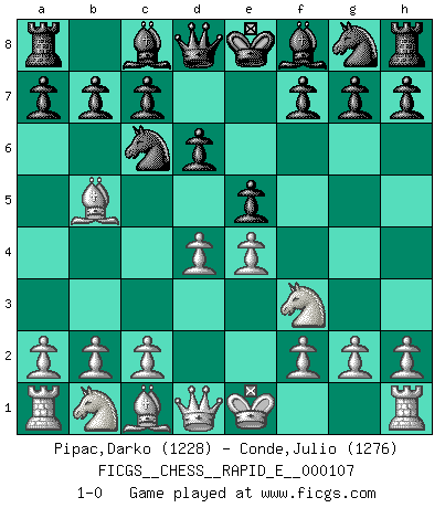 Last move : 1-0 2013 August 4 5:7:43 [Event "FICGS__CHESS__RAPID_E__000107"] [Site "FICGS"] [Date "2013.06.30"] [Round "1"] [White "Pipac,Darko"] [Black "Conde,Julio"] [Result "1-0"] [WhiteElo "1228"] [BlackElo "1276"] 1.e4 e5 2.Nf3 Nc6 3.Bb5 d6 4.d4 1-0 This chess game has been lost on time (started : 2013.06.30 16:29:46) Ruy Lopez : Old Steinitz defense Player White won this chess game. Follow this game move after move (download)A sacrifice is best refuted by accepting it. (Wilhelm Steinitz) Ich kenne keine einzige Person, die behaupten würde, Garri Kasparow sei ein guter Mensch (Nigel Short) Hay jugadores fuertes y personas amables y yo soy un jugador fuerte. (Bobby Fischer) Dans le domaine de la peinture, de la gravure et de la sculpture, dès la première décennie de notre siècle, les artistes abandonnent la représentation de la partie d'échecs pour se concentrer sur les pièces, sur les échiquiers et sur toutes les variations auxquelles les unes et les autres peuvent donner lieu. On passe en quelque sorte d'un thème social à un thème musical (au sens de la musica médiévale, c'est-à-dire d'une notion qui inclue le rythme, l'harmonie, la construction et la déconstruction, etc.). Graphiquement et picturalement, l'échiquier apparaît comme une structure ouverte, dynamique, d'une richesse infinie, autorisant toutes les combinatoires et débouchant sur des mouvements et des rythmes de nature exponentielle. (Michel Pastoureau) Those parts of the system that you can hit with a hammer (not advised) are called hardware; those program instructions that you can only curse at are called software. (Anonymous)