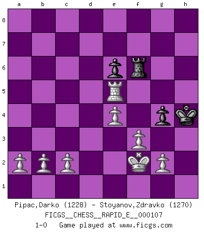 Last move : 1-0 2013 July 22 13:25:12 [Event "FICGS__CHESS__RAPID_E__000107"] [Site "FICGS"] [Date "2013.06.30"] [Round "1"] [White "Pipac,Darko"] [Black "Stoyanov,Zdravko"] [Result "1-0"] [WhiteElo "1228"] [BlackElo "1270"] 1.e4 c5 2.Nc3 a6 3.Nf3 Nc6 4.d4 cxd4 5.Nxd4 Nxd4 6.Qxd4 d6 7.h3 h6 8.Bc4 Nf6 9.O-O e5 10.Qd3 Be7 11.Be3 O-O 12.Nd5 Nxd5 13.Bxd5 Bg5 14.Bxg5 Qxg5 15.Rad1 Rd8 16.Qf3 Be6 17.Bxe6 fxe6 18.Rd3 Rf8 19.Qg4 Qxg4 20.hxg4 Rad8 21.Rfd1 Rf4 22.f3 h5 23.gxh5 Kh7 24.Rxd6 Rxd6 25.Rxd6 Rf6 26.Rd7 b5 27.Ra7 Kh6 28.Rxa6 Kxh5 29.Rb6 g5 30.Rxb5 Kh4 31.Rxe5 g4 32.Kf2 1-0 Sicilian : Closed Kingside Castling by player White (move 9) Kingside Castling by player Black (move 11) Player White won this chess game. Follow this game move after move (download)The way he plays Chess demonstrates a man's whole nature. (Stanley Ellin) Im Schach gewinnt jeder. Hat man Freunde am Spiel - und das ist die Hauptsache - ist auch der Verlust einer Partie kein Unglück. (David Bronstein) En manos de Fischer's, una diminuta ventaja teórica es tan buena como tener una Reina de ventaja. (Isaac Kashdan) Comme les marins qui ont mille raisons différentes d'aller en mer, les joueurs d'échecs en ont tout autant avant de s'installer devant une table et jouer... (Vincent Bertignac, philosophe) I take risks, sometimes patients die, but not taking risks causes more patients to die. So I guess my biggest problem is I've been cursed with the ability to do the math. (Gregory House, House M.D.)