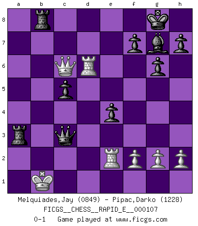 Last move : 0-1 2013 July 15 2:56:14 [Event "FICGS__CHESS__RAPID_E__000107"] [Site "FICGS"] [Date "2013.06.30"] [Round "1"] [White "Melquiades,Jay"] [Black "Pipac,Darko"] [Result "0-1"] [WhiteElo "0849"] [BlackElo "1228"] 1.e4 c5 2.Nf3 d6 3.Nc3 Bg4 4.Be2 Bxf3 5.Bxf3 Nf6 6.d4 Nc6 7.d5 Nd4 8.Be3 Nxf3+ 9.Qxf3 g6 10.O-O-O Bg7 11.Nb5 Qd7 12.a4 a6 13.Bf4 axb5 14.Bd2 bxa4 15.Rhe1 O-O 16.e5 dxe5 17.d6 exd6 18.Bg5 Qe6 19.Qxb7 Qg4 20.Bxf6 Qf4+ 21.Kb1 Qxf6 22.c3 a3 23.bxa3 Rxa3 24.Qc6 e4 25.Rxd6 Qxc3 26.Re2 Rb8+ 0-1 Sicilian Queenside Castling by player White (move 10) Kingside Castling by player Black (move 15) Player Black won this chess game. Follow this game move after move (download)He who takes the Queen's Knight's Pawn will sleep in the streets. (Anonymous) Über Kasparov: Es ist offensichtlich, daß er in einem totalitären Staat aufwuchs und deshalb zu diktatorischen Zügen neigt. (Viktor Kortschnoi) La pasion por jugar al Ajedrez es una de las mas inexplicables en el mundo. (H.G. Wells) Des combinaisons [dans le jeu d'échecs] pareilles à des mélodies. Je crois entendre pour ainsi dire la musique des coups... (Vladimir Nabokov) Lottery : A tax on people who are bad at math. (Author unknown)