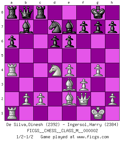 Last move : 1/2-1/2 2006 November 8 23:43:42 [Event "FICGS__CHESS__CLASS_M__000002"] [Site "FICGS"] [Date "2006.04.10"] [Round "1"] [White "De Silva,Dinesh"] [Black "Ingersol,Harry"] [Result "1/2-1/2"] [WhiteElo "2392"] [BlackElo "2384"] 1.e4 c5 2.Nf3 d6 3.d4 cxd4 4.Nxd4 Nf6 5.Nc3 a6 6.Be3 e6 7.f3 b5 8.Qd2 Nbd7 9.g4 Nb6 10.Qf2 Nfd7 11.a4 Nxa4 12.Nxa4 bxa4 13.Rxa4 Bb7 14.Be2 Be7 15.O-O O-O 16.Rfa1 Qc8 17.Rc4 Qb8 18.Rb4 Rc8 19.Rba4 Nb6 20.Rb4 Nd7 21.Rba4 1/2-1/2 Sicilian : Najdorf, Byrne (English) attack Kingside Castling by player White (move 15) Kingside Castling by player Black (move 15) This chess game ended in a draw. Follow this game move after move (download)I thought the most common mistake [in chess] was the first one: Learning the game :P (Garvin Gray, FICGS forum) Das Zentrum ist der Balkan des Schachbretts - Kriegshandlungen können in jedem Moment ausbrechen. (Aaron Nimzowitsch) Cuando tu casa esta en llamas, no puedes ser molestado por tus vecinos. O, como decinos en Ajedrez, si tu Rey esta bajo ataque, no te preocupa perder un Peón del lado de la Reina. (Gary Kasparov) La menace est plus forte que l'exécution. (Aaron Nimzovitch) If I had no sense of humor, I would long ago have committed suicide. (Mahatma Gandhi)