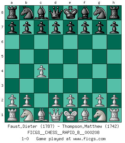 Last move : 1-0 2013 July 31 16:37:45 [Event "FICGS__CHESS__RAPID_B__000208"] [Site "FICGS"] [Date "2013.07.01"] [Round "1"] [White "Faust,Dieter"] [Black "Thompson,Matthew"] [Result "1-0"] [WhiteElo "1787"] [BlackElo "1742"] 1.c4 1-0 This chess game has been lost on time (started : 2013.07.01 13:4:11) English Opening Player White won this chess game. Follow this game move after move (download)Best by test: 1. e4 (Bobby Fischer) Fischer machte Schach einfach zu einer aufregenden Sache, wann immer er sich ans Brett setzte. (Raymond Keene) Uno no tiene que jugar muy bien, es suficiente jugar mejor que el oponente. (Siegbert Tarrasch) RxDa4 pat (...) You think that education is too expensive ? Try ignorance. (Derek Bok)