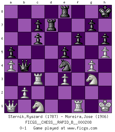 Last move : 0-1 2013 July 30 23:37:15 [Event "FICGS__CHESS__RAPID_B__000208"] [Site "FICGS"] [Date "2013.07.01"] [Round "1"] [White "Sternik,Ryszard"] [Black "Moreira,Jose"] [Result "0-1"] [WhiteElo "1787"] [BlackElo "1906"] 1.e4 e5 2.Nf3 Nc6 3.Bb5 a6 4.Bxc6 dxc6 5.Nc3 Bc5 6.d3 Qe7 7.O-O Nf6 8.h3 O-O 9.Be3 Bxe3 10.fxe3 Ne8 11.Qe1 Nd6 12.a4 a5 13.Qg3 f6 14.Rf2 Be6 15.Nh4 Ne8 16.Nf5 Qb4 17.Rb1 Rd8 18.R2f1 Rd7 19.h4 Kh8 20.h5 Nd6 21.Nh4 Re8 22.Qf3 Nf7 23.Nf5 Ng5 24.Qg3 h6 25.Qe1 Qc5 26.Kh1 b5 27.Rc1 Bf7 28.g4 b4 29.Ne2 b3 30.cxb3 Qb6 31.Rc3 Bxb3 32.Qa1 Qb4 33.Nc1 Bd5 34.Ng3 Bxe4+ 35.dxe4 Nxe4 0-1 Ruy Lopez : Exchange, Keres variation Kingside Castling by player White (move 7) Kingside Castling by player Black (move 8) Player Black won this chess game. Follow this game move after move (download)Via the squares on the chessboard, the Indians explain the movement of time and the age, the higher influences which control the world and the ties which link Chess with the human soul. (Al-Masudi) Es ist besser die Steine des Gegners zu opfern. (Savielly Grigorievitsch Tartakower) Si el Ajedrez es una ciencia, es la mas inexacta. Si el Ajedrez es un arte, es demasiado inexacto para ser visto como tal. Si el Ajedrez es un deporte, es demasiado esotérico. Si el Ajedrez es un juego, es demasiado exigente para ser solo un juego. Si el Ajedrez es una aventura, es una muy demandante. Si el Ajedrez es una pasión, es una muy gratificante. Si el Ajedrez es la vida, es una muy triste. (Anónimo) Les Echecs représentent une sphère d'idées créatrices basée sur la volonté des deux protagonistes. (Smyslov) The ego is not master in its own house. (Sigmund Freud)