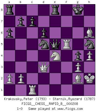 Last move : 1-0 2013 July 20 23:28:49 [Event "FICGS__CHESS__RAPID_B__000208"] [Site "FICGS"] [Date "2013.07.01"] [Round "1"] [White "Krakovsky,Peter"] [Black "Sternik,Ryszard"] [Result "1-0"] [WhiteElo "1793"] [BlackElo "1787"] 1.c4 e5 2.g3 Nf6 3.Bg2 Bc5 4.Nf3 e4 5.Ng5 Bxf2+ 6.Kxf2 Ng4+ 7.Kg1 Qxg5 8.Bxe4 Qc5+ 9.d4 Qxc4 10.Bf3 Nf6 11.Bg5 Qe6 12.Nc3 O-O 13.e4 h6 14.Bf4 d6 15.h3 Nbd7 16.Rc1 g5 17.Be3 a6 18.h4 g4 19.Bg2 Nb6 20.d5 Qe7 21.Bxh6 Re8 22.Kh2 Nh5 23.Ne2 f5 24.Rf1 fxe4 25.Nc3 Qe5 26.Nxe4 Nxd5 27.Qd3 Bf5 28.Rxf5 1-0 English Opening Kingside Castling by player Black (move 12) Player White won this chess game. Follow this game move after move (download)One doesn't have to play well, it's enough to play better than your opponent. (Siegbert Tarrasch) Es war undenkbar für die Behörden, dass ein sowjetischer Großmeister auf diese Art und Weise [Fischer-Taimanov 6:0] verliert, ohne dass es eine politischer Erklärung dafür gäbe. (Mark Taimanov) A la fecha, Fischer esta simplemente un nivel arriba de todos los mejores jugadores de Ajedrez del mundo. (John Jacobs) Lorsque vous vous retrouvez devant une position atroce, ne tendez pas un ultime piège dérisoire avec l'intention d'abandonner si l'adversaire le déjoue ! Faites-vous plutôt un devoir de résister comme si votre vie en dépendait. Jouez le coup qui vous déplairait au centuple si vous étiez dans la peau de votre tortionnaire ! Remember : Your focus determines your reality. (Qui-Gon Jinn in Star Wars ep.1)