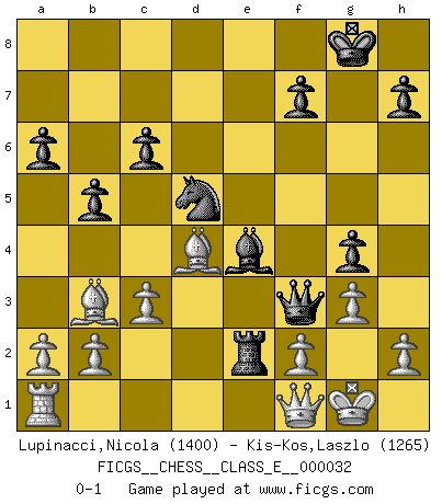 Last move : 0-1 2007 April 30 10:4:17 [Event "FICGS__CHESS__CLASS_E__000032"] [Site "FICGS"] [Date "2007.02.01"] [Round "1"] [White "Lupinacci,Nicola"] [Black "Kis-Kos,Laszlo"] [Result "0-1"] [WhiteElo "1400"] [BlackElo "1265"] 1.e4 e5 2.Nf3 Nc6 3.Bb5 a6 4.Ba4 Nf6 5.O-O Be7 6.Re1 b5 7.Bb3 O-O 8.c3 d5 9.exd5 Nxd5 10.Nxe5 Nxe5 11.Rxe5 c6 12.d4 Bd6 13.Re1 Qh4 14.g3 Qh3 15.Re4 g5 16.Qf1 Qh5 17.Bd1 Qg6 18.Nd2 Bf5 19.Re1 Rae8 20.Rxe8 Rxe8 21.Nf3 Bd3 22.Qg2 g4 23.Ne5 Bxe5 24.dxe5 Rxe5 25.Bd2 Qe6 26.Bb3 Re2 27.Be3 Qf5 28.Bd4 Be4 29.Qf1 Qf3 0-1 Ruy Lopez : Closed, 7...O-O Kingside Castling by player White (move 5) Kingside Castling by player Black (move 7) Player Black won this chess game. Follow this game move after move (download)There is no remorse like the remorse of Chess. (H. G. Wells) Das Schachspiel ist ein See, in welchem eine Mücke baden und ein Elefant ertrinken kann. (Emanuel Lasker) El juego del Ajedrez no es solamente una diversión quieta; algunas cualidades muy valuables de la mente se pueden adquirir y cultivar con el, como convertirlos en habitos disponibles para toda ocasión; ya que la vida es algo así como el Ajedrez. (Benjamin Franklin) Il n'y a pas de prix trop élevé au scalp de l'ennemi. (Koblentz) I teach you to lie, cheat and steal, and as soon as my back's turned you wait in line ? (Gregory House, House M.D.)