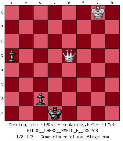 Last move : 1/2-1/2 2013 August 29 23:49:1 [Event "FICGS__CHESS__RAPID_B__000208"] [Site "FICGS"] [Date "2013.07.01"] [Round "1"] [White "Moreira,Jose"] [Black "Krakovsky,Peter"] [Result "1/2-1/2"] [WhiteElo "1906"] [BlackElo "1793"] 1.e4 c6 2.d4 d5 3.Nc3 dxe4 4.Nxe4 Bf5 5.Ng3 Bg6 6.Nf3 Nd7 7.Bd3 e6 8.O-O Ngf6 9.Bxg6 hxg6 10.c4 Qc7 11.Bg5 O-O-O 12.Qe2 Bd6 13.c5 Bf4 14.Bxf4 Qxf4 15.b4 g5 16.Qe3 Nd5 17.Qxf4 gxf4 18.Ne4 N7f6 19.Neg5 Rhf8 20.Ne5 Nc3 21.Nexf7 Rxd4 22.a3 Ne2+ 23.Kh1 Rd5 24.Nd6+ Kd7 25.Nf3 Rb8 26.Rae1 Nd4 27.Ne5+ Kc7 28.Ng6 f3 29.h4 Nh5 30.gxf3 b6 31.Ne4 Nxf3 32.Re3 Ne5 33.Nxe5 Rxe5 34.Rg1 Rf5 35.Ng5 e5 36.Ne6+ Kd7 37.Nxg7 Rf4 38.Rd3+ Ke7 39.Nxh5 Rxh4+ 40.Kg2 Rxh5 41.Rc1 Rg8+ 42.Rg3 Rxg3+ 43.fxg3 Rh6 44.cxb6 axb6 45.g4 Kd6 46.Kg3 Kd5 47.g5 Rg6 48.Kg4 e4 49.Kh5 Rg8 50.g6 c5 51.Kh6 e3 52.g7 Kd4 53.Kh7 Re8 54.b5 c4 55.g8Q Rxg8 56.Kxg8 e2 57.a4 Kd3 58.a5 bxa5 59.b6 Kd2 60.Rg1 e1Q 61.Rxe1 Kxe1 62.b7 c3 63.b8Q c2 64.Qe5+ Kd1 1/2-1/2 Caro-Kann : Classical variation Kingside Castling by player White (move 8) Queenside Castling by player Black (move 11) 10 pieces endgame at move 44 : White KRPPP , Black KRPPP WHITE : King + 1 Rook 3 Pawns BLACK : King + 1 Rook 3 Pawns Promotion Queen by player White (move 55) 9 pieces endgame at move 55 : White KRPP , Black KRPPP WHITE : King + 1 Rook 2 Pawns BLACK : King + 1 Rook 3 Pawns 8 pieces endgame at move 56 : White KRPP , Black KPPP WHITE : King + 1 Rook 2 Pawns BLACK : King + 3 Pawns 7 pieces endgame at move 58 : White KRP , Black KPPP WHITE : King + 1 Rook 1 Pawn BLACK : King + 3 Pawns Promotion Queen by player Black (move 60) 6 pieces endgame at move 61 : White KRP , Black KPP WHITE : King + 1 Rook 1 Pawn BLACK : King + 2 Pawns 5 pieces endgame at move 61 : White KP , Black KPP WHITE : King + 1 Pawn BLACK : King + 2 Pawns Promotion Queen by player White (move 63) This chess game ended in a draw. Follow this game move after move (download)The passed pawn is a criminal, who should be kept under lock and key. Mild measures, such as police surveillance, are not sufficient. (Nimzovitch) Ich habe kein Problem mit Frauen, sondern nur mit dem Niveau ihres Schachspiels (Judith Polgar) El Ajedrez es una guerra en un tablero. El objetivo es aplastar la mente del oponente. (Bobby Fischer) La victoire dans une partie d'Echecs appartient la plupart du temps à celui qui voit un peu plus loin que l'adversaire. (Lasker) Real knowledge is to know the extent of one's ignorance. (Confucius)