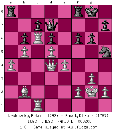 Last move : 1-0 2013 August 7 11:42:9 [Event "FICGS__CHESS__RAPID_B__000208"] [Site "FICGS"] [Date "2013.07.01"] [Round "1"] [White "Krakovsky,Peter"] [Black "Faust,Dieter"] [Result "1-0"] [WhiteElo "1793"] [BlackElo "1787"] 1.c4 e5 2.g3 d6 3.Nc3 Be6 4.Bg2 Nc6 5.d3 Qd7 6.Rb1 Rb8 7.b4 Nf6 8.b5 Nd4 9.e3 Nf5 10.Nf3 Be7 11.O-O g6 12.Re1 O-O 13.e4 Ng7 14.d4 exd4 15.Nd5 Nxd5 16.cxd5 Bh3 17.Qxd4 Bxg2 18.Kxg2 Nh5 19.Qxa7 Rfc8 20.Qd4 Bf6 21.Qc4 Ra8 22.a4 b6 23.Nd4 Bxd4 24.Qxd4 Qe7 25.Bb2 f6 26.Rbc1 Rf8 27.Rc6 Qd7 28.Rec1 1-0 English Opening Kingside Castling by player White (move 11) Kingside Castling by player Black (move 12) Player White won this chess game. Follow this game move after move (download)It is not a move, even the best move that you must seek, but a realizable plan. (Eugene Znosko-Borovsky) Das ganze Leben mit einer Ehefrau ist wie ein Endspiel mit ungleichfarbigen Läufern. (Viktor Kortschnoi) Uno no tiene que jugar muy bien, es suficiente jugar mejor que el oponente. (Siegbert Tarrasch) Aidez vos pièces, elles vous aideront. (Paul Morphy) Even the best needles are not sharp at both ends. (Chinese proverb)