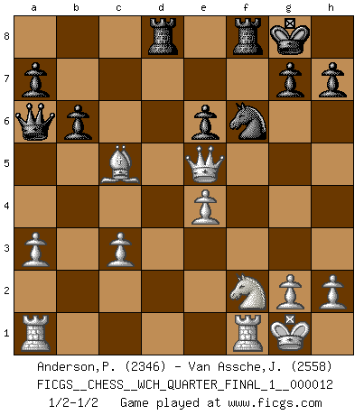 Last move : 1/2-1/2 2013 August 15 14:36:50 [Event "FICGS__CHESS__WCH_QUARTER_FINAL_1__000012"] [Site "FICGS"] [Date "2013.07.02"] [Round "6"] [White "Anderson,Peter W."] [Black "Van Assche,Jeroen"] [Result "1/2-1/2"] [WhiteElo "2346"] [BlackElo "2558"] 1.d4 Nf6 2.c4 e6 3.Nc3 Bb4 4.f3 d5 5.a3 Bxc3+ 6.bxc3 c5 7.cxd5 Nxd5 8.dxc5 f5 9.Nh3 Qa5 10.e4 fxe4 11.fxe4 Nf6 12.Be2 O-O 13.Nf2 Nbd7 14.O-O Nxc5 15.Be3 b6 16.Qd6 Ba6 17.Bxa6 Rad8 18.Qe5 Qxa6 19.Bxc5 1/2-1/2 Nimzo-Indian : Kmoch variation Kingside Castling by player Black (move 12) Kingside Castling by player White (move 14) This chess game ended in a draw. Follow this game move after move (download)I don't believe in psychology. I believe in good moves. (Bobby Fischer) Schachspieler können ausgezeichnet Varianten am Schachbrett berechnen, aber nicht im realen Leben. Zu stark ist der Individualismus im Schach ausgeprägt, und für viele ist ein kleiner momentaner persönlicher Vorteil wichtiger als ein weit größerer Vorteil von morgen. (Anatoly Karpov) ¿Que sería del Ajedrez sin errores graciosos?. (Kurt Richter) Les Echecs représentent une sphère d'idées créatrices basée sur la volonté des deux protagonistes. (Smyslov) Always be a first-rate version of yourself, instead of a second-rate version of somebody else. (Judy Garland)