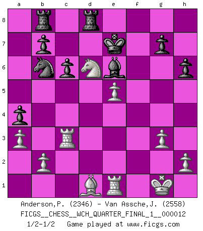 Last move : 1/2-1/2 2013 October 15 7:42:34 [Event "FICGS__CHESS__WCH_QUARTER_FINAL_1__000012"] [Site "FICGS"] [Date "2013.07.02"] [Round "8"] [White "Anderson,Peter W."] [Black "Van Assche,Jeroen"] [Result "1/2-1/2"] [WhiteElo "2346"] [BlackElo "2558"] 1.d4 Nf6 2.c4 e6 3.g3 d5 4.Bg2 dxc4 5.Nf3 Bb4+ 6.Bd2 a5 7.a3 Bd6 8.Qa4+ Nc6 9.Qxc4 O-O 10.Bc3 Qe8 11.O-O e5 12.dxe5 Nxe5 13.Nxe5 Bxe5 14.Re1 c6 15.Nd2 Be6 16.Qc5 Nd7 17.Qe3 Bxc3 18.Qxc3 Qe7 19.Rac1 Qf6 20.Ne4 Qxc3 21.Rxc3 Rfd8 22.f4 h6 23.Nd6 Rab8 24.e4 f6 25.Bf3 Kf8 26.Bh5 Nb6 27.e5 fxe5 28.fxe5 Ke7 29.Be2 a4 30.Bd1 1/2-1/2 Catalan : Open, 5.Nf3 Kingside Castling by player Black (move 9) Kingside Castling by player White (move 11) This chess game ended in a draw. Follow this game move after move (download)Why must I lose to this idiot ? (Aron Nimzovich) Man wirke der falschen Auffassung entgegen, als ob jeder Zug Unmittelbares zu leisten habe; auch Werte- und Ruhezüge haben ihre Existenzberechtigung. (Aaron Nimzowitsch) En el Ajedrez, cuando menos, el valiente hereda la tierra. (Edmar Mednis) Psychologiquement, tu dois avoir confiance en toi même, mais cette confiance doit être basée sur des faits. (Robert Fischer) Kids, you tried your best and you failed miserably. The lesson is, never try. (Simpsons)