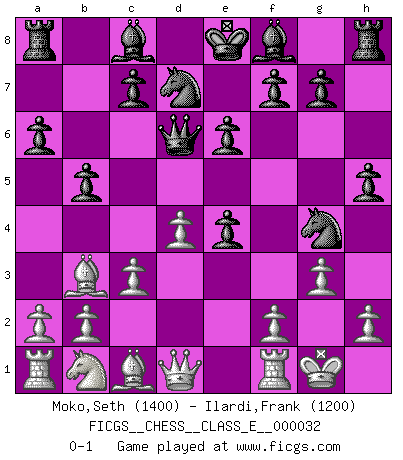 Last move : 0-1 2007 April 17 23:24:14 [Event "FICGS__CHESS__CLASS_E__000032"] [Site "FICGS"] [Date "2007.02.01"] [Round "1"] [White "Moko,Seth"] [Black "Ilardi,Frank"] [Result "0-1"] [WhiteElo "1400"] [BlackElo "1200"] 1.e4 d6 2.d4 Nf6 3.e5 dxe5 4.Nf3 e4 5.Ne5 a6 6.Bc4 e6 7.O-O Qd6 8.c3 b5 9.Bb3 Nbd7 10.Ng4 Nxg4 11.g3 h5 0-1 King's pawn Opening Kingside Castling by player White (move 7) Player Black won this chess game. Follow this game move after move (download)In Chess, just as in life, today's bliss may be tomorrow's poison. (Assaic) Ich las kürzlich ein Buch von Nietzsche. Er sagte Religion verdumme nur die Menschen. Ich stimme zu. (Robert James Fischer) Algunos sacrificios son sólidos, los demás son míos. (Mikhail Tal) Les Cavaliers se révèlent fort utiles dans les positions fermées. D'habitude, les Fous sont un peu plus forts que les Cavaliers dans les positions ouvertes. Qu'on le veuille ou non, il restera toujours des exceptions ! Heh, heh, heh. Time to abandon ship. (General Grievous in Star Wars ep.3)