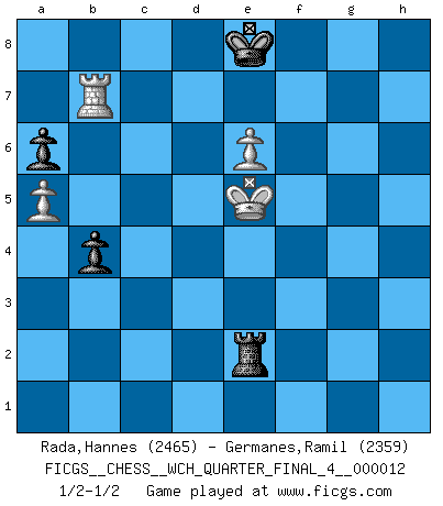 Last move : 1/2-1/2 2013 December 8 4:54:56 [Event "FICGS__CHESS__WCH_QUARTER_FINAL_4__000012"] [Site "FICGS"] [Date "2013.07.02"] [Round "7"] [White "Rada,Hannes"] [Black "Germanes,Ramil"] [Result "1/2-1/2"] [WhiteElo "2465"] [BlackElo "2359"] 1.c4 e5 2.g3 Nf6 3.Bg2 d5 4.cxd5 Nxd5 5.Nc3 Nb6 6.Nf3 Nc6 7.O-O Be7 8.d3 O-O 9.Be3 Be6 10.Rc1 f5 11.b4 a6 12.a3 Rc8 13.Bc5 Kh8 14.Bxe7 Qxe7 15.Nd2 Nd8 16.Na4 Nxa4 17.Qxa4 c6 18.Rc5 Nf7 19.Qc2 f4 20.a4 Bd7 21.Rc1 Ng5 22.Qc3 Rce8 23.Ne4 Nxe4 24.Bxe4 Qe6 25.Rd1 Qa2 26.Qd2 Qe6 27.f3 Qh3 28.Qe1 Rf6 29.Qf2 fxg3 30.Qxg3 Qxg3+ 31.hxg3 g6 32.g4 Re7 33.Kg2 h6 34.d4 Rd6 35.Kg3 Kg7 36.Rd3 exd4 37.Rc4 Rde6 38.Rcxd4 Be8 39.Rd8 Re5 40.Ra8 h5 41.gxh5 Rg5+ 42.Kf4 Rxh5 43.R3d8 Bf7 44.Rdb8 Bd5 45.Ra7 Rf7+ 46.Ke3 Bxe4 47.fxe4 b5 48.Rxf7+ Kxf7 49.a5 c5 50.bxc5 Rxc5 51.Kd4 Rc4+ 52.Kd5 g5 53.e5 Rc2 54.e6+ Kf6 55.Rf8+ Ke7 56.Rf7+ Ke8 57.Ra7 Rd2+ 58.Ke5 Rxe2+ 59.Kf6 Rf2+ 60.Kxg5 b4 61.Rb7 Ra2 62.Kf6 Rf2+ 63.Ke5 Re2+ 64.Kd6 Rd2+ 65.Ke5 Re2+ 66.Kf6 Rf2+ 67.Ke5 Re2+ 1/2-1/2 English Opening Kingside Castling by player White (move 7) Kingside Castling by player Black (move 8) 10 pieces endgame at move 50 : White KRPPP , Black KRPPP WHITE : King + 1 Rook 3 Pawns BLACK : King + 1 Rook 3 Pawns 9 pieces endgame at move 58 : White KRPP , Black KRPPP WHITE : King + 1 Rook 2 Pawns BLACK : King + 1 Rook 3 Pawns 8 pieces endgame at move 60 : White KRPP , Black KRPP WHITE : King + 1 Rook 2 Pawns BLACK : King + 1 Rook 2 Pawns This chess game ended in a draw. Follow this game move after move (download)A great player and a great example for many. His book My 60 Memorable Games had a big impact on me. It is a shame he didn't continue to enrich the world of chess with his unparalleled understanding after 1972. (Jan Timman, about Bobby Fischer's death) Wie, soll nun auch die Opposition abgeschafft werden? Ja, es tut mir leid, Ihnen diesen Schmerz nicht ersparen zu können. (Aaron Nimzowitsch) Me siento como si fuera una pieza en una partida de Ajedrez, cuando mi oponente me indica: esa pieza no puede ser movida. (Soren Kierkegaard) A chaque perte on perd un peu de soi. (Joël Lautier) I have opinions of my own - strong opinions - but I don't always agree with them. (George Bush)
