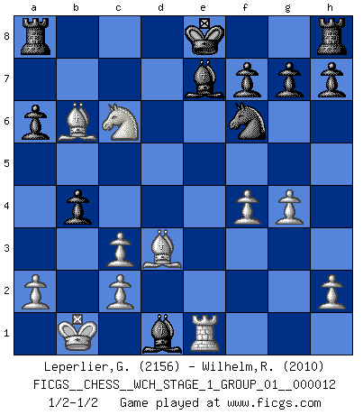 Last move : 1/2-1/2 2013 August 19 8:44:5 [Event "FICGS__CHESS__WCH_STAGE_1_GROUP_01__000012"] [Site "FICGS"] [Date "2013.07.02"] [Round "1"] [White "Leperlier,Gabriel"] [Black "Wilhelm,Robert"] [Result "1/2-1/2"] [WhiteElo "2156"] [BlackElo "2010"] 1.e4 c5 2.Nf3 d6 3.d4 cxd4 4.Nxd4 Nf6 5.Nc3 a6 6.Be3 e6 7.f4 b5 8.Bd3 Bb7 9.Qf3 Nbd7 10.g4 b4 11.Nce2 Nc5 12.Ng3 Nfd7 13.Be2 Nf6 14.Bd3 Nfd7 15.O-O-O d5 16.Kb1 dxe4 17.Nxe4 Nf6 18.Nxe6 Ncxe4 19.Nxd8 Nc3+ 20.bxc3 Bxf3 21.Rhe1 Bxd1 22.Bb6 Be7 23.Nc6 Kd7 24.Ne5+ Ke8 25.Nc6 1/2-1/2 Sicilian : Najdorf, Byrne (English) attack Queenside Castling by player White (move 15) This chess game ended in a draw. Follow this game move after move (download)Human affairs are like a Chess game: only those who do not take it seriously can be called good players. (Hung Tzu Ch'eng) Matt entspricht nicht immer den Tatsachen. (Savielly Grigorievitsch Tartakower) Cada Peón es potencialmente una Reina. (James Mason) Les pièces de l'échiquier étaient impitoyables. Elles le retenaient, elles l'absorbaient. Il y avait de l'horreur en cela, mais aussi une harmonie unique. Car, qu'y a-t-il dans le monde, à part les échecs ? (V. Nabokov) Perhaps chess is the wrong game for the times (The Chess Master and the Computer, by Garry Kasparov - 2010)