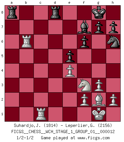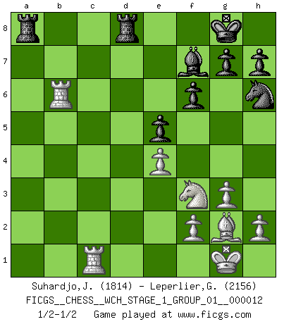 Last move : 1/2-1/2 2013 September 20 1:11:12 [Event "FICGS__CHESS__WCH_STAGE_1_GROUP_01__000012"] [Site "FICGS"] [Date "2013.07.02"] [Round "1"] [White "Suhardjo,Johanes"] [Black "Leperlier,Gabriel"] [Result "1/2-1/2"] [WhiteElo "1814"] [BlackElo "2156"] 1.c4 e5 2.Nc3 Nf6 3.Nf3 Nc6 4.g3 d5 5.cxd5 Nxd5 6.Bg2 Nb6 7.O-O Be7 8.a3 O-O 9.b4 Be6 10.Rb1 f6 11.d3 a5 12.b5 Nd4 13.Nd2 Qc8 14.e3 Nf5 15.Qc2 Rd8 16.a4 Bb4 17.Na2 Bf8 18.Nc3 Nh6 19.Nf3 Bb4 20.Na2 c6 21.bxc6 Qxc6 22.Qxc6 bxc6 23.Nxb4 axb4 24.Rxb4 Nxa4 25.d4 c5 26.dxc5 Nxc5 27.e4 Nd3 28.Rb6 Nxc1 29.Rxc1 Bf7 1/2-1/2 English Opening Kingside Castling by player White (move 7) Kingside Castling by player Black (move 8) This chess game ended in a draw. Follow this game move after move (download)Kasparov : J'adoube , Ivanchuk : S'il vous plaît ! (Garry Kasparov & Vassily Ivanchuk, Linares 1997) Schach ist mein Leben, meine Leidenschaft, was ich gelernt habe und seit meinem 14. Lebensjahr profimässig praktiziere. Darauf zu verzichten, würde mir sehr schwer fallen. (Viktor Kortschnoi) Cuando tu no sabes absolutamente que mas hacer, es tiempo de entrar en pánico. (John van der Wiel) Les échecs c'est le défi de l'alpiniste, toujours plus haut, prêt à tout pour monter à l'assaut du Roi ennemi. Les échecs, c'est de la musique en mouvement, un ballet majestueux pour les yeux. C'est de la poésie composée par les fantômes du passé qui au même titre que Rimbaud ou Verlaine méritent notre admiration. Les échecs, c'est de la peinture ou le moindre mouvement modifie le tableau pour en faire un Picasso ou un Van Gogh. Les échecs, c'est tout et rien, c'est la vie et la mort. Jjulie33 sur le forum de France-Echecs. The problem with troubleshooting is that trouble shoots back. (Anonymous)