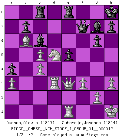 Last move : 1/2-1/2 2013 October 6 0:19:47 [Event "FICGS__CHESS__WCH_STAGE_1_GROUP_01__000012"] [Site "FICGS"] [Date "2013.07.02"] [Round "1"] [White "Duenas,Alexis"] [Black "Suhardjo,Johanes"] [Result "1/2-1/2"] [WhiteElo "1817"] [BlackElo "1814"] 1.d4 Nf6 2.c4 g6 3.Nc3 d5 4.cxd5 Nxd5 5.e4 Nxc3 6.bxc3 Bg7 7.Bc4 c5 8.Ne2 Nc6 9.Be3 O-O 10.O-O Qc7 11.Rc1 Rd8 12.Bf4 Qd7 13.dxc5 Qe8 14.Bd5 Bd7 15.h3 a5 16.Bc7 Rdc8 17.Bb6 e6 18.Bxc6 Bxc6 19.Qd3 Qd7 20.Qe3 e5 21.c4 f5 22.Nc3 Rf8 23.Nd5 fxe4 24.Rcd1 Qf7 25.Qxe4 a4 26.f3 Kh8 27.a3 Rac8 28.Rfe1 Rfe8 29.Rd3 Re6 30.Qe3 Kg8 31.Kh1 R6e8 32.Kg1 Kh8 33.Kh1 Kg8 34.Kg1 Kh8 35.Kh1 1/2-1/2 King's Indian defense, 3.Nc3 Kingside Castling by player Black (move 9) Kingside Castling by player White (move 10) This chess game ended in a draw. Follow this game move after move (download)Pawns are born free, yet they are everywhere in chains. (Rick Kennedy) Obwohl ich vom Stil her kaum zu den Priestern der Schachkunst gezählt werde, halte ich Schach doch für eine Kunst. (Tigran Petrosjan) Aquellos que dicen que entienden al Ajedrez, no entienden nada. (Robert Hubner) A chaque perte on perd un peu de soi. (Joël Lautier) Without deviation from the norm, progress is not possible. (Frank Zappa)