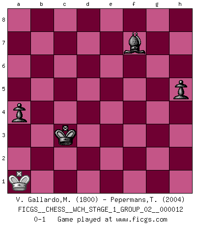 Last move : 0-1 2014 January 5 6:19:30 [Event "FICGS__CHESS__WCH_STAGE_1_GROUP_02__000012"] [Site "FICGS"] [Date "2013.07.02"] [Round "1"] [White "V. Gallardo,Miguel"] [Black "Pepermans,Toon"] [Result "0-1"] [WhiteElo "1800"] [BlackElo "2004"] 1.e4 e6 2.d4 d5 3.e5 c5 4.c3 Nc6 5.Nf3 Qb6 6.Bd3 cxd4 7.cxd4 Bd7 8.O-O Nxd4 9.Nxd4 Qxd4 10.Nc3 a6 11.Qe2 Ne7 12.Kh1 Qb6 13.f4 d4 14.Ne4 Nf5 15.a4 Rc8 16.a5 Qc6 17.Bd2 Qd5 18.Rfc1 Bc6 19.b4 Be7 20.Nc5 Bxc5 21.Rxc5 Qd7 22.Rac1 O-O 23.Kg1 Rfd8 24.Be1 Ne3 25.Bd2 Nd5 26.Qh5 g6 27.Qh4 Nc3 28.Qf6 Nd5 29.Qh4 Ne3 30.Qf2 Ba4 31.Rxc8 Rxc8 32.Rxc8+ Qxc8 33.Be4 Qc4 34.h3 Bb5 35.Qh4 Qc7 36.Qf2 b6 37.g4 bxa5 38.bxa5 h6 39.Bxe3 dxe3 40.Qxe3 Qxa5 41.Qd4 Qc7 42.Kf2 a5 43.f5 exf5 44.gxf5 Qd7 45.Qd6 gxf5 46.Bd5 Qxd6 47.exd6 Kg7 48.Ke3 Kf6 49.Kd4 Be8 50.Kc4 a4 51.Kd4 f4 52.h4 Bd7 53.Kc3 Ke5 54.Bxf7 f3 55.Kb4 f2 56.Bc4 Kxd6 57.Kc3 Kc5 58.Bf1 Bb5 59.Bh3 f1Q 60.Bxf1 Bxf1 61.Kb2 Kb4 62.Ka2 Bd3 63.Ka1 Kb3 64.h5 Be2 65.Kb1 Bxh5 66.Ka1 Bf7 67.Kb1 Kc3 68.Ka1 h5 0-1 French : Advance, Milner-Barry gambit Kingside Castling by player White (move 8) Kingside Castling by player Black (move 22) 10 pieces endgame at move 47 : White KBPP , Black KBPPPP WHITE : King + 1 Bishop 2 Pawns BLACK : King + 1 Bishop 4 Pawns 9 pieces endgame at move 54 : White KBPP , Black KBPPP WHITE : King + 1 Bishop 2 Pawns BLACK : King + 1 Bishop 3 Pawns 8 pieces endgame at move 56 : White KBP , Black KBPPP WHITE : King + 1 Bishop 1 Pawn BLACK : King + 1 Bishop 3 Pawns Promotion Queen by player Black (move 59) 7 pieces endgame at move 60 : White KBP , Black KBPP WHITE : King + 1 Bishop 1 Pawn BLACK : King + 1 Bishop 2 Pawns 6 pieces endgame at move 60 : White KP , Black KBPP WHITE : King + 1 Pawn BLACK : King + 1 Bishop 2 Pawns 5 pieces endgame at move 65 : White K , Black KBPP WHITE : King + BLACK : King + 1 Bishop 2 Pawns Player Black won this chess game. Follow this game move after move (download)In Chess, at least, the brave inherit the earth. (Edmar Mednis) Ein unbeabsichtigtes Patt ist der Gipfel der Dummheit. (Anonymous) Durante una competencia de Ajedrez, un Maestro de Ajedrez deberá ser una combinación de presa de caza y un Monge. (Alexander Alekhine) Les sacrifices démontrent seulement que quelqu'un a gaffé. (Savielly Tartacover) True nature is revealed in times of difficulty. (Chinese proverb)