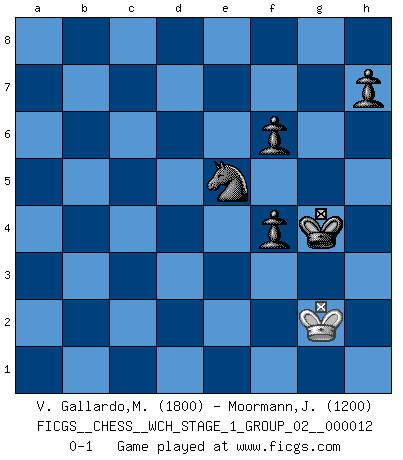 Last move : 0-1 2013 October 8 6:10:2 [Event "FICGS__CHESS__WCH_STAGE_1_GROUP_02__000012"] [Site "FICGS"] [Date "2013.07.29"] [Round "1"] [White "V. Gallardo,Miguel"] [Black "Moormann,Joerg"] [Result "0-1"] [WhiteElo "1800"] [BlackElo "1200"] 1.e4 e5 2.Nf3 Nc6 3.d4 exd4 4.Nxd4 Nf6 5.Nxc6 bxc6 6.Bd3 d5 7.e5 Ng4 8.O-O Bc5 9.Qe2 Qe7 10.Bf4 g5 11.Bd2 O-O 12.Nc3 Nxe5 13.Rfe1 f6 14.a3 Qd6 15.Qh5 Rf7 16.Be2 a5 17.Na4 Ba7 18.c4 Bf5 19.c5 Bxc5 20.Nxc5 Qxc5 21.Rac1 Qb6 22.b4 axb4 23.Bxb4 Kg7 24.Red1 Ra4 25.g4 Be4 26.Qh3 d4 27.Bf1 Rd7 28.Bg2 Bxg2 29.Qxg2 d3 30.h3 Rxb4 31.axb4 Qxb4 32.Rxc6 d2 33.Rc2 Qb3 34.Qe4 Qxh3 35.R1xd2 Rxd2 36.Rxc7+ Nf7 37.Rc1 Qh4 38.Rf1 Ne5 39.Qb7+ Rd7 40.Qg2 Rd4 41.f4 Rxf4 42.Rxf4 gxf4 43.Qb7+ Kh6 44.Qh1 Qxh1+ 45.Kxh1 Kg5 46.Kg2 Kxg4 0-1 Scotch : Schmidt variation Kingside Castling by player White (move 8) Kingside Castling by player Black (move 11) 10 pieces endgame at move 42 : White KQRP , Black KQNPPP WHITE : King + 1 Queen 1 Rook 1 Pawn BLACK : King + 1 Queen 1 Knight 3 Pawns 9 pieces endgame at move 42 : White KQP , Black KQNPPP WHITE : King + 1 Queen 1 Pawn BLACK : King + 1 Queen 1 Knight 3 Pawns 8 pieces endgame at move 44 : White KP , Black KQNPPP WHITE : King + 1 Pawn BLACK : King + 1 Queen 1 Knight 3 Pawns 7 pieces endgame at move 45 : White KP , Black KNPPP WHITE : King + 1 Pawn BLACK : King + 1 Knight 3 Pawns 6 pieces endgame at move 46 : White K , Black KNPPP WHITE : King + BLACK : King + 1 Knight 3 Pawns Player Black won this chess game. Follow this game move after move (download)If I win a tournament, I win it by myself. I do the playing. Nobody helps me. (Bobby Fischer) Ich würde die 30 stärksten Spieler der USA im Simultanspiel besiegen. (José Raúl Capablanca) Existen dos clases de sacrificios: los correctos y los míos. (Mikhail Tal) Il vaut mieux sacrifier les pièces de l'adversaire. (Xavier Tartacover) It's only after you lost everything, Tyler says, that you're free to do anything. (Chuck Palahniuk, Fight Club)