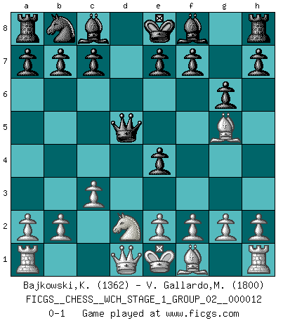Last move : 0-1 2013 July 23 19:54:51 [Event "FICGS__CHESS__WCH_STAGE_1_GROUP_02__000012"] [Site "FICGS"] [Date "2013.07.02"] [Round "1"] [White "Bajkowski,Karol"] [Black "V. Gallardo,Miguel"] [Result "0-1"] [WhiteElo "1362"] [BlackElo "1800"] 1.d4 d5 2.Nf3 Nf6 3.Nc3 g6 4.Bg5 Ne4 5.Nxe4 dxe4 6.Nd2 Qxd4 7.c3 Qd5 0-1 Queen's pawn game Player Black won this chess game. Follow this game move after move (download)I give 98 percent of my mental energy to Chess. Others give only 2 percent. (Bobby Fischer) Dein Körper muss in Topform sein. Dein Schach verfällt, wenn dein Körper verfällt. Der Körper kann nicht vom Geist getrennt werden. (Robert James Fischer) Es muy difícil jugar en contra de la teoría de Einstein. - en su primera derrota en contra de Fischer (Mikhail Tal) Je ne suis pas le dernier à jouer lâchement des coups douteux pendant le zeïtnot de l'adversaire pour l'achever: en effet les coups qui font le plus peur sont ceux que l'on ne comprend pas. Je me fais souvent peur quand je joue. (Un professeur anonyme) See no evil, hear no evil, speak no evil. (The 3 monkeys)