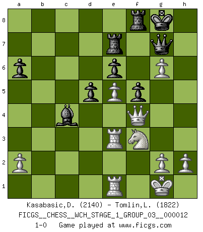Last move : 1-0 2013 August 12 4:50:14 [Event "FICGS__CHESS__WCH_STAGE_1_GROUP_03__000012"] [Site "FICGS"] [Date "2013.07.02"] [Round "1"] [White "Kasabasic,Djordje"] [Black "Tomlin,Lincoln"] [Result "1-0"] [WhiteElo "2140"] [BlackElo "1822"] 1.e4 e6 2.d4 d5 3.Nc3 Nf6 4.e5 Nfd7 5.f4 c5 6.Nf3 Nc6 7.Be3 Qb6 8.Na4 Qa5+ 9.c3 cxd4 10.b4 Nxb4 11.cxb4 Bxb4+ 12.Bd2 Bxd2+ 13.Nxd2 O-O 14.Bd3 b5 15.Nb2 Nb6 16.O-O Nc4 17.Nbxc4 bxc4 18.Bxh7+ Kxh7 19.Qh5+ Kg8 20.Nf3 g6 21.Qh6 Qc7 22.f5 f6 23.fxg6 Qg7 24.Qh4 Qh8 25.Qxd4 Ba6 26.Qc5 c3 27.Rfe1 Bc4 28.Rac1 Qg7 29.Rxc3 Rae8 30.Qd4 a6 31.Rce3 Re7 32.Qg4 f5 33.Qf4 1-0 French : Steinitz, Boleslavsky variation Kingside Castling by player Black (move 13) Kingside Castling by player White (move 16) Player White won this chess game. Follow this game move after move (download)War is the child of passion, passion is the child of narcissism and narcissism is the child. (...) Another game ? (Thibault de Vassal) Ich habe die besten Aussichten, den ersten Preis zu gewinnen - denn jeder muss gegen Steinitz spielen, nur ich nicht! (Wilhelm Steinitz) El estómago es una parte esencial del maestro de Ajedrez. (Bent Larsen) Tous ces prétendus hommes politiques sont les pions, les Cavaliers, les Tours ou les Fous d'une partie d'échecs qui se jouera tant qu'un hasard ne renversera pas l'échiquier. (Honoré de Balzac) Nobody is always a winner, and anybody who says he is, is either a liar or doesn't play poker. (Amarillo Slim)