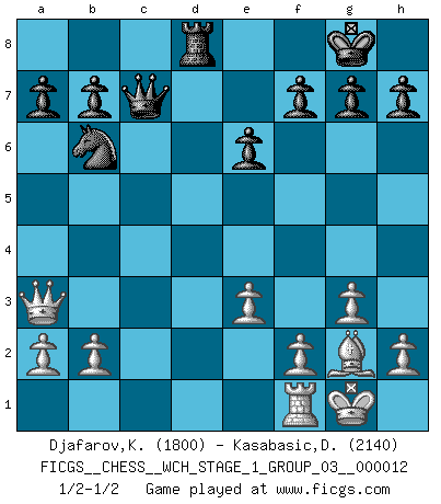 Last move : 1/2-1/2 2013 August 15 15:56:26 [Event "FICGS__CHESS__WCH_STAGE_1_GROUP_03__000012"] [Site "FICGS"] [Date "2013.07.02"] [Round "1"] [White "Djafarov,Kirill"] [Black "Kasabasic,Djordje"] [Result "1/2-1/2"] [WhiteElo "1800"] [BlackElo "2140"] 1.d4 Nf6 2.c4 e6 3.Nf3 d5 4.g3 dxc4 5.Bg2 c5 6.O-O Nc6 7.Ne5 Bd7 8.Na3 cxd4 9.Naxc4 Bc5 10.Qb3 O-O 11.Bf4 Qc8 12.Rac1 Nd5 13.Nxd7 Qxd7 14.Ne5 Nxe5 15.Bxe5 Rac8 16.Rcd1 Nb6 17.e3 Rfd8 18.Bxd4 Bxd4 19.Rxd4 Qc7 20.Rxd8+ Rxd8 21.Qa3 1/2-1/2 Queen's pawn game Kingside Castling by player White (move 6) Kingside Castling by player Black (move 10) This chess game ended in a draw. Follow this game move after move (download)Chess is imagination. (David Bronstein) Wenn es im Universum noch irgendwo intelligente Lebewesen gibt, dann kennen sie Go. (Emanuel Lasker) Bobby Fischer es el mas grande genio de Ajedrez de todos los tiempos. (Alexander Kotov) On est toujours la mazette de quelqu'un d'autre. (Anonyme) For a mechanic, you seem to do an excessive amount of thinking. (C-3PO in Star Wars ep.2)