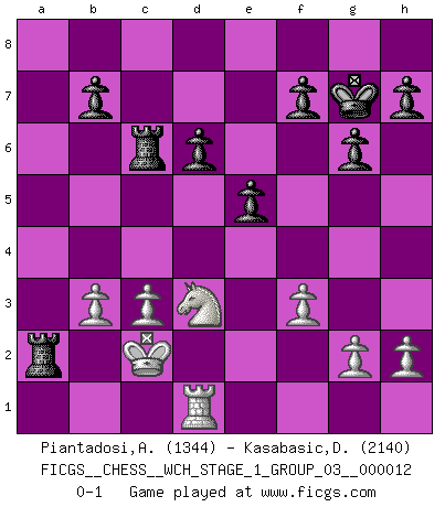 Last move : 0-1 2013 August 22 0:8:32 [Event "FICGS__CHESS__WCH_STAGE_1_GROUP_03__000012"] [Site "FICGS"] [Date "2013.07.02"] [Round "1"] [White "Piantadosi,Angelo"] [Black "Kasabasic,Djordje"] [Result "0-1"] [WhiteElo "1344"] [BlackElo "2140"] 1.e4 c5 2.Nf3 d6 3.d4 cxd4 4.Nxd4 Nf6 5.Nc3 g6 6.Be3 Bg7 7.f3 Nc6 8.Bc4 O-O 9.O-O Qb6 10.Qd2 Nxe4 11.Nxe4 Bxd4 12.Bxd4 Qxd4+ 13.Qxd4 Nxd4 14.Bd3 Bf5 15.c3 Nc6 16.Nf2 Bxd3 17.Nxd3 Kg7 18.Rfe1 e6 19.Rad1 a5 20.Kf2 a4 21.Ke3 Na5 22.Kd4 Rfc8 23.Nc1 Nc4 24.b3 axb3 25.axb3 e5+ 26.Kd3 Nb2+ 27.Kc2 Nxd1 28.Rxd1 Rc6 29.Nd3 Ra2+ 0-1 Sicilian : Dragon, Yugoslav attack Kingside Castling by player Black (move 8) Kingside Castling by player White (move 9) Player Black won this chess game. Follow this game move after move (download)Chess is no whit inferior to the violin, and we have a large number of professional violinists. (Mikhail Botvinnik) Das Schachspiel übertrifft alle anderen Spiele so weit wie der Chimborasso einen Misthaufen. (Arthur Schopenhauer) Siempre es mejor sacrificar los hombres de tu oponente. (Savielly Tartakower) Le thème de l'attaque double intervient d'une manière ou d'une autre dans l'immense majorité des combinaisons. (Youri Averbakh) The beginning is the most important part of the work. (Plato)