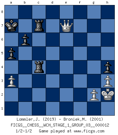 Last move : 1/2-1/2 2013 October 30 9:14:10 [Event "FICGS__CHESS__WCH_STAGE_1_GROUP_03__000012"] [Site "FICGS"] [Date "2013.07.02"] [Round "1"] [White "Lommler,Jan Peter"] [Black "Broniek,Mariusz Maciej"] [Result "1/2-1/2"] [WhiteElo "2019"] [BlackElo "2001"] 1.e4 c5 2.Nf3 d6 3.d4 cxd4 4.Nxd4 Nf6 5.Nc3 a6 6.Bg5 e6 7.f4 Qb6 8.Qd2 Qxb2 9.Nb3 Qa3 10.Bxf6 gxf6 11.Be2 Nc6 12.O-O Bd7 13.Nb1 Qb4 14.Qe3 Ne7 15.a3 Qa4 16.f5 Rc8 17.Nc3 Qc6 18.Rf3 Qc7 19.Rd1 Bg7 20.Qf4 exf5 21.Nd5 Nxd5 22.exd5 O-O 23.Bd3 Rfe8 24.Kh1 Re5 25.Nd4 Rxd5 26.Rdf1 Re8 27.Nxf5 Bxf5 28.Bxf5 h5 29.Qh4 Kf8 30.h3 Re2 31.Bd3 R2e5 32.Rxf6 Bxf6 33.Qxf6 Rc5 34.Qh8+ Ke7 35.Qg7 Ke8 36.Rxf7 Qxf7 37.Bg6 Qxg6 38.Qxg6+ Kd7 39.Kh2 Rc3 40.Qf7+ Kc6 41.Qg8 Kc7 42.Qf7+ Kb6 43.Qg6 Rd5 44.Qe4 Rdc5 45.Qe7 Rxc2 46.Qd8+ Ka7 47.Qxd6 h4 48.Qd4 R2c4 49.Qd2 a5 50.Qd8 Ra4 51.Qd3 Rac4 52.Qd8 b6 53.Qe7+ Rc7 1/2-1/2 Sicilian : Najdorf, 7...Qb6 Kingside Castling by player White (move 12) Kingside Castling by player Black (move 22) This chess game ended in a draw. Follow this game move after move (download)There must have been a time when men were demigods, or they could not have invented Chess. (Gustav Schenk) Im Schach gibt es keinen Platz für Galanterie. (Irving Chernev) Nunca nadie ha ganado una partida de Ajedrez rindiendose. (Unknown) La solitude du joueur d'Echecs à l'approche du mat est semblable à celle du condamné. (Francis Szpiner) All men can see these tactics whereby I conquer, but what none can see is the strategy out of which victory is evolved. (Sun Tzu)