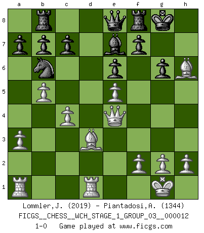 Last move : 1-0 2013 August 4 22:55:14 [Event "FICGS__CHESS__WCH_STAGE_1_GROUP_03__000012"] [Site "FICGS"] [Date "2013.07.02"] [Round "1"] [White "Lommler,Jan Peter"] [Black "Piantadosi,Angelo"] [Result "1-0"] [WhiteElo "2019"] [BlackElo "1344"] 1.e4 e6 2.d3 d5 3.Nd2 Nf6 4.Ngf3 dxe4 5.dxe4 Nbd7 6.e5 Nd5 7.Ne4 Be7 8.a3 O-O 9.c4 N5b6 10.Qc2 Nc5 11.Nxc5 Bxc5 12.Bd3 h6 13.O-O Bd7 14.b4 Be7 15.Qe2 Bc6 16.Rd1 Qe8 17.b5 Bxf3 18.Qxf3 Rb8 19.Qe4 g6 20.Bxh6 1-0 French : King's Indian attack Kingside Castling by player Black (move 8) Kingside Castling by player White (move 13) Player White won this chess game. Follow this game move after move (download)Chess is thirty to forty percent psychology. You don't have this when you play a computer. I can't confuse it. (Judith Polgar) Du kannst im Schach nur gut werden, wenn du das Spiel liebst. (Robert James Fischer) El jugador blanco perdió porque fallo en recordar la coreccta continuación y tuvo que pensar por sí mismo las movidas. (Siegbert Tarrasch) Les échecs sont un jeu par leur forme, un art par leur essence et une science par sa difficulté d'acquisition. Ils peuvent vous procurer autant de plaisir qu'un bon livre ou une belle musique, mais vous n'aurez une réelle joie que si vous arrivez à bien jouer. (Tigran Petrosian) The man who strikes first admits that his ideas have given out. (Chinese proverb)