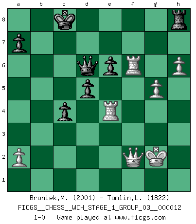 Last move : 1-0 2013 July 20 22:59:56 [Event "FICGS__CHESS__WCH_STAGE_1_GROUP_03__000012"] [Site "FICGS"] [Date "2013.07.02"] [Round "1"] [White "Broniek,Mariusz Maciej"] [Black "Tomlin,Lincoln"] [Result "1-0"] [WhiteElo "2001"] [BlackElo "1822"] 1.e4 e6 2.d4 d5 3.Nc3 Nf6 4.e5 Nfd7 5.f4 c5 6.Nf3 Nc6 7.Be3 Qb6 8.Na4 Qa5+ 9.c3 cxd4 10.b4 Nxb4 11.cxb4 Bxb4+ 12.Bd2 Bxd2+ 13.Nxd2 O-O 14.Bd3 b5 15.Nb2 Nb6 16.O-O Nc4 17.Nbxc4 bxc4 18.Bxh7+ Kxh7 19.Qh5+ Kg8 20.Nf3 f6 21.exf6 Qc7 22.fxg7 Qxg7 23.Ne5 Rf5 24.Qh4 Qf6 25.Qh3 d3 26.Rf3 Kf8 27.Rd1 Ke7 28.Qh7+ Kd6 29.Rfxd3 Rxe5 30.fxe5+ Qxe5 31.Rd4 Ba6 32.Qh3 Rh8 33.Qa3+ Kd7 34.h4 Qd6 35.Qh3 Kc6 36.h5 Qe5 37.h6 Rh7 38.Rh4 Bb5 39.Qf3 Qd6 40.Re1 Kb6 41.g4 Be8 42.g5 Bg6 43.Rf4 Kc7 44.Kg2 Rh8 45.Qf2 Kc8 46.Rf6 Be4+ 47.Rxe4 1-0 French : Steinitz, Boleslavsky variation Kingside Castling by player Black (move 13) Kingside Castling by player White (move 16) Player White won this chess game. Follow this game move after move (download)No one ever won a game by resigning. (Unknown) Ich hatte meine größten Erfolge, als ich 47 Jahre alt war. Kasparow war noch nicht mal 42 und hat das Schach schon im Stich gelassen. (Viktor Kortschnoi) Cuando no sepas que mover, espera por una idea que se le venga a la la cabeza de tu oponente. Tenlo por seguro de que esa idea estará incorrecta. (Siegbert Tarrasch) Ce qui caractérise les parties de combat, c'est que si le défenseur a constamment de difficiles problèmes à résoudre, l'attaquant doit chercher sans relâche de nouvelles possibilités d'attaque. (Koblentz) The human is the only animal species whose members are able to talk themselves into difficulties that would not otherwise exist. (Wendell Johnson)