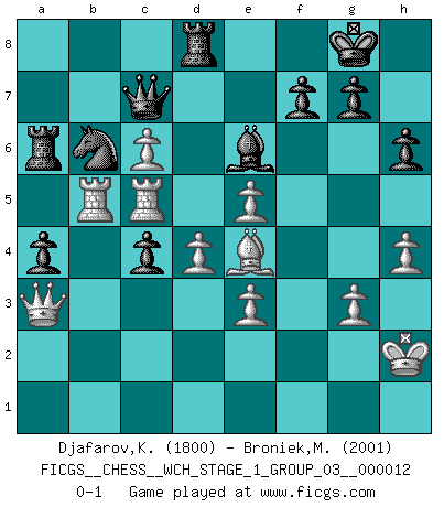 Last move : 0-1 2013 October 21 15:50:27 [Event "FICGS__CHESS__WCH_STAGE_1_GROUP_03__000012"] [Site "FICGS"] [Date "2013.07.02"] [Round "1"] [White "Djafarov,Kirill"] [Black "Broniek,Mariusz Maciej"] [Result "0-1"] [WhiteElo "1800"] [BlackElo "2001"] 1.Nf3 d5 2.d4 Nf6 3.c4 e6 4.g3 dxc4 5.Bg2 a6 6.Ne5 Bb4+ 7.Nc3 Nd5 8.O-O O-O 9.Qc2 b5 10.Nxd5 exd5 11.b3 c6 12.bxc4 dxc4 13.Rd1 Qc7 14.Be4 h6 15.a4 Ra7 16.Bh7+ Kh8 17.Be4 Bd6 18.f4 Bh3 19.e3 Re8 20.Bd2 Bxe5 21.fxe5 Nd7 22.Ba5 Qxa5 23.axb5 Qc7 24.bxc6 Nb6 25.Ra5 Be6 26.Rb1 Rd8 27.Qc1 Kg8 28.Qa3 Nd5 29.Rc5 a5 30.R1b5 Nb6 31.h4 a4 32.Kh2 Ra6 0-1 Reti Opening Kingside Castling by player White (move 8) Kingside Castling by player Black (move 8) Player Black won this chess game. Follow this game move after move (download)The winner of the game is the player who makes the next-to-last mistake. (Savielly Tartakover) Ich las kürzlich ein Buch von Nietzsche. Er sagte Religion verdumme nur die Menschen. Ich stimme zu. (Robert James Fischer) Vive, pierde y aprende al observar a tu oponente como ganar. (Amber Steenbock) On n'a jamais que l'âge auquel on a commence à jouer aux échecs car après on cesse de vieillir. (Capablanca) You must do what you feel is right... of course. (Obi-Wan Kenobi in Star Wars ep.4)