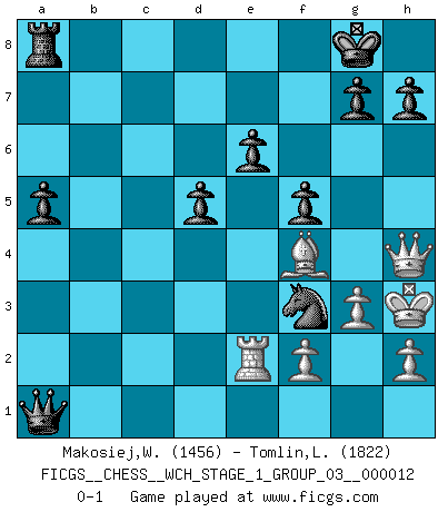 Last move : 0-1 2013 August 27 17:47:42 [Event "FICGS__CHESS__WCH_STAGE_1_GROUP_03__000012"] [Site "FICGS"] [Date "2013.07.02"] [Round "1"] [White "Makosiej,Wladyslaw"] [Black "Tomlin,Lincoln"] [Result "0-1"] [WhiteElo "1456"] [BlackElo "1822"] 1.d4 d5 2.c4 c6 3.Nc3 Nf6 4.e3 a6 5.Nf3 Bf5 6.Bd3 Bxd3 7.Qxd3 e6 8.O-O Bb4 9.Bd2 O-O 10.Rfd1 a5 11.a3 Bxc3 12.bxc3 Qc7 13.Ne5 Nbd7 14.Nxd7 Nxd7 15.c5 b6 16.cxb6 Nxb6 17.e4 Nc4 18.Re1 Rfb8 19.exd5 cxd5 20.g3 Rb3 21.Bf4 Qc6 22.Qf3 Nxa3 23.Re5 Nc2 24.Rc1 Rxc3 25.Qg4 Nxd4 26.Rxc3 Qxc3 27.Re3 Qa1+ 28.Kg2 Nc2 29.Re2 Ne1+ 30.Kh3 f5 31.Qh4 Nf3 0-1 QGD Slav defense Kingside Castling by player White (move 8) Kingside Castling by player Black (move 9) Player Black won this chess game. Follow this game move after move (download)If your opponent offers you a draw, try to work out why he thinks he's worse off. (Nigel Short) Ich habe die Schachforschung dermaßen betrieben, dass sie auf eine wissenschaftliche Basis gestellt wurde. (Mikhail Moiseyevich Botvinik) Solo el jugador con la iniciativa tiene el derecho a atacar. (Wilhelm Steinitz) La menace est plus forte que l'exécution. (Aaron Nimzovitch) The absolute truth is the thing that makes people laugh. (Carl Reiner)