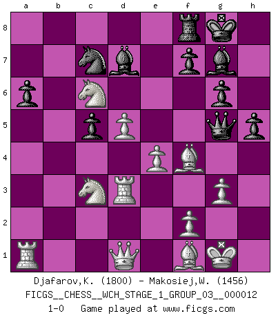 Last move : 1-0 2013 October 7 19:38:28 [Event "FICGS__CHESS__WCH_STAGE_1_GROUP_03__000012"] [Site "FICGS"] [Date "2013.07.02"] [Round "1"] [White "Djafarov,Kirill"] [Black "Makosiej,Wladyslaw"] [Result "1-0"] [WhiteElo "1800"] [BlackElo "1456"] 1.Nf3 g6 2.c4 Bg7 3.d4 c5 4.d5 d6 5.Nc3 Nf6 6.e4 O-O 7.h3 e6 8.Bd3 Na6 9.O-O Nc7 10.Re1 Rb8 11.Bf1 e5 12.a3 a6 13.b4 cxb4 14.axb4 b6 15.c5 bxc5 16.bxc5 dxc5 17.Nxe5 Nh5 18.Nc6 Qh4 19.Re3 Nf4 20.Nxb8 Bxh3 21.g3 Qg5 22.Nc6 Bd7 23.Rd3 h5 24.Bxf4 1-0 Reti Opening Kingside Castling by player Black (move 6) Kingside Castling by player White (move 9) Player White won this chess game. Follow this game move after move (download)A strong memory, concentration, imagination, and a strong will is required to become a great Chess player. (Bobby Fischer) Vielleicht wirkt die Aura früherer Spieler glanzvoller als die der heutigen Spieler, aber das liegt daran, dass man kein Programm wie Fritz hatte, das einem all die Löcher in ihren Partien zeigt. (Vladimir Kramnik) El muchacho (en ese entonces un niño de 12 años llamado Anatoly Karpov) no tiene ni idea de lo que es el Ajedrez y no hay futuro en absoluto para el en esta profesión. (Mikhail Botvinnik) Plusieurs personnes se sont demandées comment Tal faisait pour gagner... En fait, c'est très simple ! Il met ses pièces au centre de l'échiquier et les sacrifie quelque part ! (David Bronstein) If we knew what we were doing, we would not call it research. (Albert Einstein)