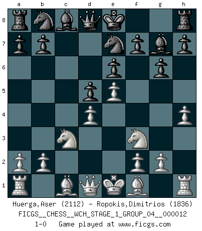 Last move : 1-0 2013 August 27 12:53:32 [Event "FICGS__CHESS__WCH_STAGE_1_GROUP_04__000012"] [Site "FICGS"] [Date "2013.07.02"] [Round "1"] [White "Huerga,Aser"] [Black "Ropokis,Dimitrios"] [Result "1-0"] [WhiteElo "2112"] [BlackElo "1836"] 1.e4 c5 2.Nf3 g6 3.d4 Bg7 4.c3 cxd4 5.cxd4 d5 6.e5 e6 7.Nc3 Ne7 8.h4 1-0 This chess game has been lost on time (started : 2013.07.02 19:7:13) Sicilian : Hungarian variation Player White won this chess game. Follow this game move after move (download)Chess is a foolish expedient for making idle people believe they are doing something very clever when they are only wasting their time. (George Bernard Shaw) Später, ... hatte ich zunehmend Erfolg in entscheidenden Partien. Vielleicht weil ich eine einfache Wahrheit erkannte: nicht nur ich hatte Angst, auch mein Gegner. (Mikhail Nekhemyevich Tal) Sin errores no puede haber brillantez. (Emanuel Lasker) Avant la finale, les dieux ont créé le milieu de partie. (Tarrasch) Heh, heh, heh. Time to abandon ship. (General Grievous in Star Wars ep.3)