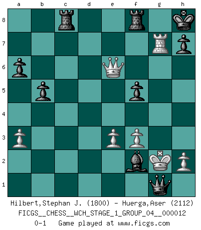 Last move : 0-1 2013 October 20 23:52:48 [Event "FICGS__CHESS__WCH_STAGE_1_GROUP_04__000012"] [Site "FICGS"] [Date "2013.07.29"] [Round "1"] [White "Hilbert,Stephan J."] [Black "Huerga,Aser"] [Result "0-1"] [WhiteElo "1800"] [BlackElo "2112"] 1.b4 e5 2.Bb2 Bxb4 3.Bxe5 Nf6 4.c4 O-O 5.a3 Be7 6.e3 c5 7.Nf3 Nc6 8.Bb2 d5 9.cxd5 Qxd5 10.Nc3 Qd6 11.Nb5 Qd8 12.Qc2 a6 13.Nc3 b5 14.Be2 Bb7 15.O-O Rc8 16.Ne4 Nxe4 17.Qxe4 Na5 18.Qf5 c4 19.Rfd1 Nb3 20.Rab1 Bxf3 21.Bxf3 Nxd2 22.Qg4 c3 23.Ba1 f5 24.Qg3 Bh4 25.Qe5 Nxf3+ 26.gxf3 Qg5+ 27.Kh1 c2 28.Qe6+ Kh8 29.Rg1 Bxf2 30.Bxg7+ Qxg7 31.Rxg7 cxb1Q+ 32.Kg2 Qg1+ 0-1 Polish (Sokolsky) opening Kingside Castling by player Black (move 4) Kingside Castling by player White (move 15) Promotion Queen by player Black (move 31) Player Black won this chess game. Follow this game move after move (download)The King is a fighting piece. Use it ! (Wilhelm Steinitz) Der Knackpunkt bei der Konzentration ist, daß wir nur durch sie etwas Neues und Ungewöhnliches am Schachbrett finden können. Sie ist der einzige Weg durch neue neue Ideen eine Überraschung zu bereiten. (Garry Kasparov) Una compensación adecuada por un sacrificio es tener una combinación sólida que conduce a una posición ganadora; una compensación adecuada por una metida de pata es dejar a tu oponente arrebatar una derrota de las fauces de la victoria. (Bruce A. Moon) La tactique est l'élément le plus important du milieu de jeu. (Siegbert Tarrasch) First of all, we have to go back to the classical time control. (Anatoly Karpov)