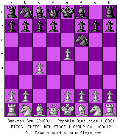 Last move : 1-0 2013 August 31 12:59:46 [Event "FICGS__CHESS__WCH_STAGE_1_GROUP_04__000012"] [Site "FICGS"] [Date "2013.07.02"] [Round "1"] [White "Berkman,Sam"] [Black "Ropokis,Dimitrios"] [Result "1-0"] [WhiteElo "2000"] [BlackElo "1836"] 1.d4 Nf6 2.c4 e5 3.dxe5 1-0 This chess game has been lost on time (started : 2013.07.02 19:7:13) Budapest defense declined Player White won this chess game. Follow this game move after move (download)I know people who have all the will in the world, but still can't play good Chess. (Bobby Fischer) Ich bin der einzige Schachspieler, der sich während der Vorbereitungen zum Turnier verletzt hat. (Woody Allen) El Ajedrez es el juego mas altamente simbólico, pero las agresiones estan por lo tanto aún mas francamente representadas en la partida. Tal vez comenzo como un juego de guerra; Algo como la representación de una batalla en miniatura entre las fuerzas de dos reinos. (Karl Meninger) On n'a jamais que l'âge auquel on a commence à jouer aux échecs car après on cesse de vieillir. (Capablanca) That's absurd. I love it. (Gregory House, House M.D.)