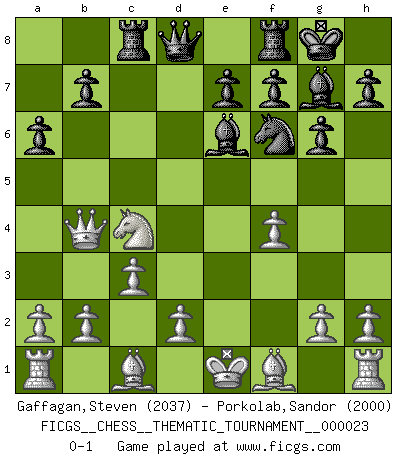 Last move : 0-1 2007 July 6 3:56:37 [Event "FICGS__CHESS__THEMATIC_TOURNAMENT__000023"] [Site "FICGS"] [Date "2007.02.01"] [Round "1"] [White "Gaffagan,Steven"] [Black "Porkolab,Sandor"] [Result "0-1"] [WhiteElo "2037"] [BlackElo "2000"] 1.e4 c5 2.f4 d5 3.Nf3 dxe4 4.Ne5 Nd7 5.Nc3 Ngf6 6.Nc4 a6 7.Qe2 g6 8.Nxe4 Nxe4 9.Qxe4 Nf6 10.Qe5 Bg7 11.Qxc5 Be6 12.c3 Rc8 13.Qb4 O-O 0-1 This chess game has been lost on time (started : 2007.02.01 23:42:56) Sicilian : Grand Prix attack Kingside Castling by player Black (move 13) Player Black won this chess game. Follow this game move after move (download)A good sacrifice is one that is not necessarily sound but leaves your opponent dazed and confused. (Rudolph Spielmann) Es gibt Leute, die glauben, alles wäre vernünftig, was man mit einem ernsthaften Gesicht tut. (Georg Christoph Lichtenberg) El Ajedrez es un regaderazo frío para la mente. (Sir John Simon) J'apprécie les joueurs d'est-indienne, c'est grâce à eux que je nourris ma famille depuis tant d'années. (Petrosian) There are more things in heaven and earth than practically anywhere else. (Unknown)