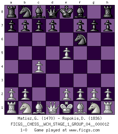 Last move : 1-0 2013 September 1 1:5:47 [Event "FICGS__CHESS__WCH_STAGE_1_GROUP_04__000012"] [Site "FICGS"] [Date "2013.07.02"] [Round "1"] [White "Matisz,Gergely"] [Black "Ropokis,Dimitrios"] [Result "1-0"] [WhiteElo "1470"] [BlackElo "1836"] 1.d4 Nf6 2.c4 e5 3.dxe5 1-0 This chess game has been lost on time (started : 2013.07.02 19:7:13) Budapest defense declined Player White won this chess game. Follow this game move after move (download)Man is a frivolous, a specious creature, and like a Chess player, cares more for the process of attaining his goal than for the goal itself. (Dostoyevsky) Es ist schade, dass viele Schachsportler vergessen, wie wichtig Auftreten und angemessene Kleidung sind. (Alexandra Kosteniuk) Tu eres para mi la Reina en d8 y yo soy el Peón en d7!!. (GM Eduard Gufeld) A ce moment-là, je menaçais de comprendre la position ! (Clément L'Heureux) Whoever said the pen is mightier than the sword obviously never encountered automatic weapons. (US General Douglas MacArthur)