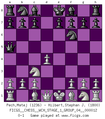 Last move : 0-1 2013 September 3 13:15:43 [Event "FICGS__CHESS__WCH_STAGE_1_GROUP_04__000012"] [Site "FICGS"] [Date "2013.07.29"] [Round "1"] [White "Pech,Matej"] [Black "Hilbert,Stephan J."] [Result "0-1"] [WhiteElo "1236"] [BlackElo "1800"] 1.e4 d5 2.exd5 Qxd5 3.Nc3 Qa5 4.d4 Nf6 0-1 This chess game has been lost on time (started : 2013.07.29 22:41:23) Scandinavian (centre counter) defense Player Black won this chess game. Follow this game move after move (download)For me, Chess is life and every game is like a new life. Every Chess player gets to live many lives in one lifetime. (Eduard Gufeld) Wir können eben der zündenden Macht des Opfers nicht wiederstehen, denn die Begeisterung für das Opfer liegt in der Natur des Menschen. (Rudolf Spielmann) Yo considero que Fischer es uno de los expertos mas grandes de aperturas de siempre. (Keith Hayward) Il n'y a pas eu de défaite parce que je ne crois pas que cet ordinateur ait jamais existé. IBM a triché en refusant d'imprimer les modes de recherche de la machine. C'est évident, pendant le match, des coups décisifs ont été joués par des êtres humains. Aujourd'hui, les meilleurs spécialistes en informatique ne peuvent toujours pas expliquer comment Deep-Blue a pu jouer contre la logique des ordinateurs. IBM a gagné une guerre de communication, mais ils sont incapables de prouver que l'ordinateur a gagné tout seul. (Garry Kasparov) Wisdom doesn't necessarily come with age. Sometimes age just shows up all by itself. (Tom Watson)