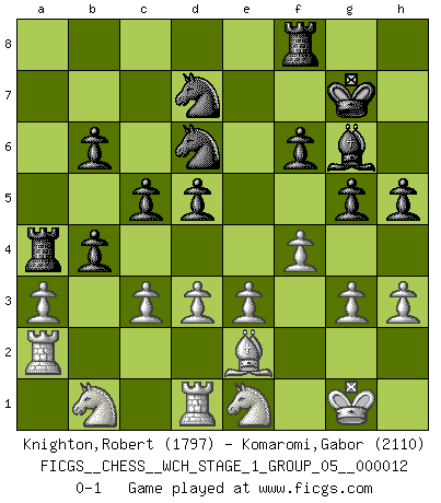 Last move : 0-1 2013 October 26 6:55:17 [Event "FICGS__CHESS__WCH_STAGE_1_GROUP_05__000012"] [Site "FICGS"] [Date "2013.07.02"] [Round "1"] [White "Knighton,Robert"] [Black "Komaromi,Gabor"] [Result "0-1"] [WhiteElo "1797"] [BlackElo "2110"] 1.b4 e5 2.b5 a6 3.Bb2 axb5 4.Bxe5 d5 5.e3 c6 6.Be2 Nf6 7.d3 Nbd7 8.Bg3 Qa5+ 9.Qd2 Qxd2+ 10.Kxd2 Be7 11.Nf3 O-O 12.h3 Nc5 13.Nd4 Bd7 14.Be5 Ra6 15.a3 Rfa8 16.c3 g6 17.Rd1 Ne8 18.Ra2 Na4 19.Bf3 f6 20.Bh2 Nb6 21.Ke1 Kf7 22.Nc2 h5 23.Nb4 Ra4 24.Rad2 Be6 25.Kf1 Bd6 26.Kg1 Bxh2+ 27.Kxh2 Nd6 28.Nc2 Kg7 29.Nd4 Bf7 30.g3 Nd7 31.Be2 g5 32.Re1 Rh8 33.Nb3 Re8 34.Red1 Ne5 35.Nd4 Bg6 36.Ra2 c5 37.Nc2 b6 38.Kg1 Rf8 39.Ne1 b4 40.f4 Nd7 0-1 Polish (Sokolsky) opening Kingside Castling by player Black (move 11) Player Black won this chess game. Follow this game move after move (download)A thorough understanding of the typical mating continuations makes the most complicated sacrificial combinations leading up to them not only not difficult, but almost a matter of course. (Siegbert Tarrasch) Fallen sollten polizeilich verboten werden. (Savielly Grigorievitsch Tartakower) Los finales de Peón son del Ajedrez lo que el cesped es del Golf. (Cecil Purdy) Celui qui prend des risques peut perdre, celui qui n'en prend pas perd toujours. (Xavier Tartacover) It's not a bug - it's an undocumented feature. (Anonymous)