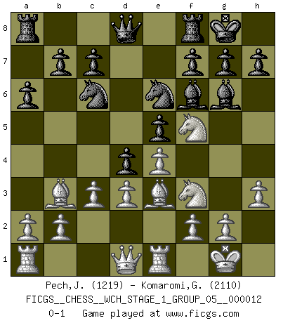 Last move : 0-1 2013 August 23 12:26:4 [Event "FICGS__CHESS__WCH_STAGE_1_GROUP_05__000012"] [Site "FICGS"] [Date "2013.07.02"] [Round "1"] [White "Pech,Jaroslav senior"] [Black "Komaromi,Gabor"] [Result "0-1"] [WhiteElo "1219"] [BlackElo "2110"] 1.e4 e5 2.Nf3 Nc6 3.Bb5 a6 4.Ba4 Nf6 5.O-O d6 6.c3 Be7 7.Re1 Bg4 8.h3 Bh5 9.d3 O-O 10.Nbd2 Nd7 11.Nf1 Nc5 12.Bc2 Ne6 13.Ng3 Bg6 14.Be3 Bf6 15.Nf5 d5 16.Bb3 d4 0-1 This chess game has been lost on time (started : 2013.07.02 19:8:49) Ruy Lopez : Steinitz defense deferred (Russian defense) Kingside Castling by player White (move 5) Kingside Castling by player Black (move 9) Player Black won this chess game. Follow this game move after move (download)Many have become Chess Masters, no one has become the Master of Chess. (Siegbert Tarrasch) Wie kann ich Remis annehmen? Ich weiß ja gar nicht, wie ich stehe! (Fritz Sämisch) El Ajedrez es el juego mas altamente simbólico, pero las agresiones estan por lo tanto aún mas francamente representadas en la partida. Tal vez comenzo como un juego de guerra; Algo como la representación de una batalla en miniatura entre las fuerzas de dos reinos. (Karl Meninger) Il vaut toujours mieux jouer un plan faux de façon logique que de n'avoir pas de plan du tout. (Victor Kortchnoï) Creativity involves breaking out of established patterns in order to look at things in a different way. (Edward De Bono)