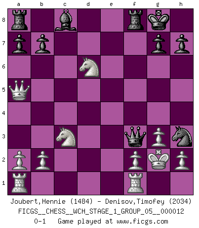 Last move : 0-1 2013 July 27 9:34:45 [Event "FICGS__CHESS__WCH_STAGE_1_GROUP_05__000012"] [Site "FICGS"] [Date "2013.07.02"] [Round "1"] [White "Joubert,Hennie"] [Black "Denisov,Timofey"] [Result "0-1"] [WhiteElo "1484"] [BlackElo "2034"] 1.e4 e5 2.Nf3 d6 3.Bc4 Nc6 4.d4 exd4 5.c3 dxc3 6.Qb3 Qd7 7.Nxc3 Na5 8.Qb4 Nxc4 9.Qxc4 Nf6 10.O-O Be7 11.e5 dxe5 12.Nxe5 Qe6 13.Qxc7 Bd6 14.Qa5 O-O 15.Bf4 Nh5 16.Nxf7 Nxf4 17.Nxd6 Qg4 18.g3 Nh3+ 19.Kg2 Qf3+ 0-1 Philidor's defense Kingside Castling by player White (move 10) Kingside Castling by player Black (move 14) Player Black won this chess game. Follow this game move after move (download)Life is a kind of Chess, with struggle, competition, good and ill events. (Benjamin Franklin) Ein unbeabsichtigtes Patt ist der Gipfel der Dummheit. (Anonymous) Cuando la partida de Ajedrez termina, el Peón y el Rey regresan a la misma caja. (Irish saying) Ce n'est pas pour s'amuser qu'il joue aux échecs : il célèbre un culte. (Vladimir Nabokov) You can only get smarter by playing a smarter opponent. (Revolver, movie)