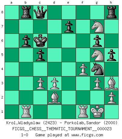 Last move : 1-0 2007 October 2 15:11:22 [Event "FICGS__CHESS__THEMATIC_TOURNAMENT__000023"] [Site "FICGS"] [Date "2007.02.01"] [Round "1"] [White "Krol,Wladyslaw"] [Black "Porkolab,Sandor"] [Result "1-0"] [WhiteElo "2423"] [BlackElo "2000"] 1.e4 c5 2.f4 d5 3.Nf3 dxe4 4.Ng5 Nf6 5.Bc4 Bg4 6.Bxf7+ Kd7 7.Qxg4+ Nxg4 8.Be6+ Kc6 9.Bxg4 g6 10.Nc3 Bg7 11.Ne6 Qg8 12.Nxe4 h5 13.Bh3 Nd7 14.d3 Rc8 15.Bd2 Bxb2 16.Rb1 Bd4 17.c3 Bg7 18.a4 b6 19.a5 Rb8 20.axb6 axb6 21.O-O Nf6 22.N4g5 Ng4 23.g3 Qc8 24.Nxg7 1-0 Sicilian : Grand Prix attack Kingside Castling by player White (move 21) Player White won this chess game. Follow this game move after move (download)Many Chess players were surprised when after the game, Fischer quietly explained: 'I had already analyzed this possibility' in a position which I thought was not possible to foresee from the opening. (Mikhail Tal) Matt entspricht nicht immer den Tatsachen. (Savielly Grigorievitsch Tartakower) Una victoria por una combinación errónea, aunque sea espectacular, me llena de horror artístico. (Wilhelm Steinitz) Dieu déplace le joueur, et celui-ci la pièce. Quel Dieu derrière Dieu commence donc la trame ? Arturo Perez-Reverte (prix de littérature policière 1993). Only sick music makes money today. (Friedrich Nietzsche)