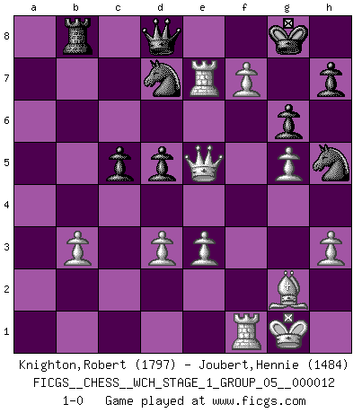 Last move : 1-0 2013 August 8 11:0:14 [Event "FICGS__CHESS__WCH_STAGE_1_GROUP_05__000012"] [Site "FICGS"] [Date "2013.07.02"] [Round "1"] [White "Knighton,Robert"] [Black "Joubert,Hennie"] [Result "1-0"] [WhiteElo "1797"] [BlackElo "1484"] 1.c4 Nf6 2.g3 g6 3.e3 Bg7 4.Nc3 O-O 5.Bg2 d6 6.h3 Be6 7.Bxb7 Nbd7 8.d3 Rb8 9.Bg2 c5 10.Nge2 Nb6 11.b3 a5 12.Bb2 a4 13.Nb5 axb3 14.axb3 Qd7 15.Nf4 Rfe8 16.Ra7 Qd8 17.Nc7 Qc8 18.Nfxe6 fxe6 19.Nxe8 Qxe8 20.O-O d5 21.f4 Nh5 22.Bxg7 Kxg7 23.g4 Nf6 24.Qa1 Kg8 25.Qe5 Kf7 26.cxd5 exd5 27.g5 Nh5 28.f5 Kg8 29.Rxe7 Qd8 30.f6 Nd7 31.f7+ 1-0 English, 1...Nf6 (Anglo-Indian defense) Kingside Castling by player Black (move 4) Kingside Castling by player White (move 20) Player White won this chess game. Follow this game move after move (download)In complicated positions, Bobby Fischer hardly had to be afraid of anybody. (Paul Keres) Kritik überlasse ich den Spießern. Ich zeige nichts, wofür ich mich schämen muss. (Alexandra Kosteniuk) De eso se trata el Ajedrez. Un día le das una lección a tu oponente y al día siguiente el te da una a tí. (Bobby Fischer) Demandez au pauvre Cg1 ce qu'il en pense. Eduard Gufeld à propos de la variante Saemisch de l'Est-Indienne. Life is verb, not a noun. (Charlotte Perkins Gilman)